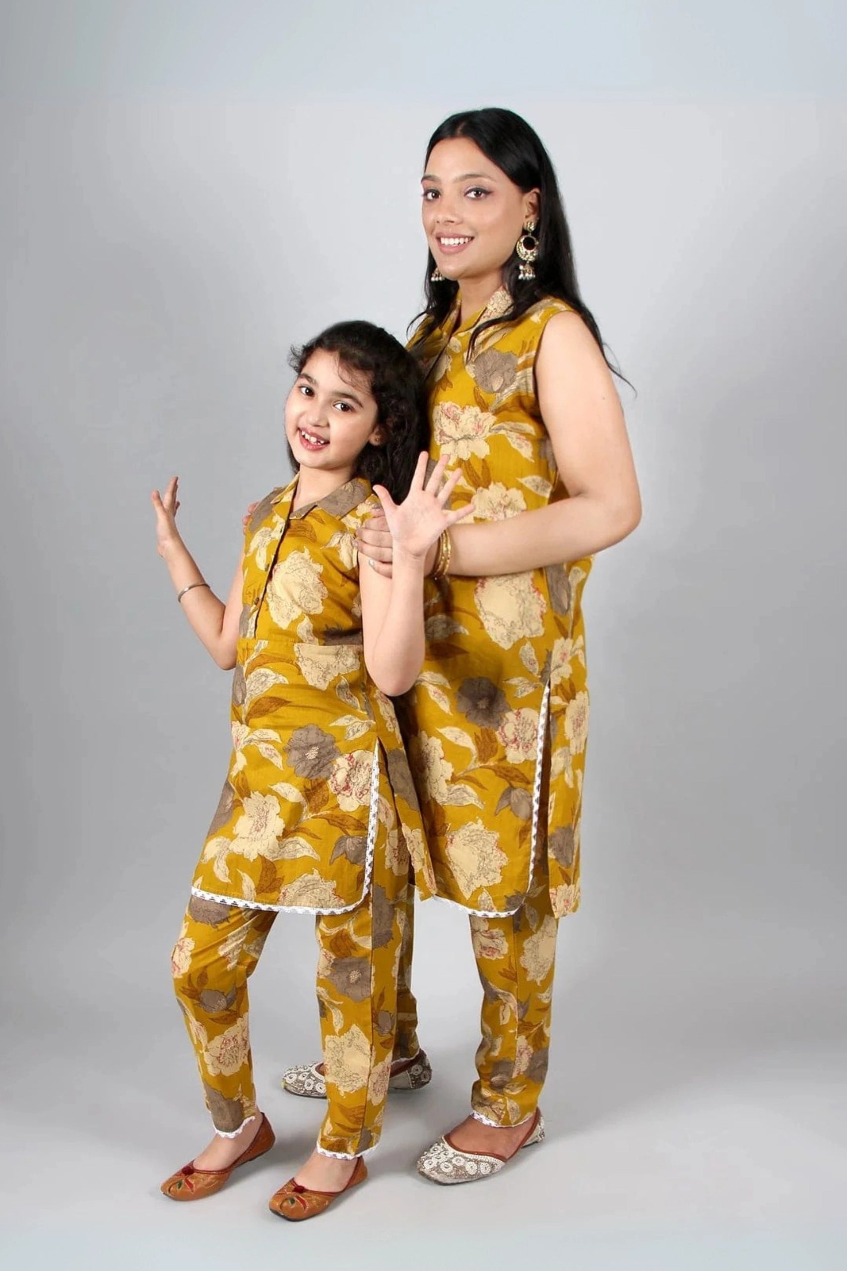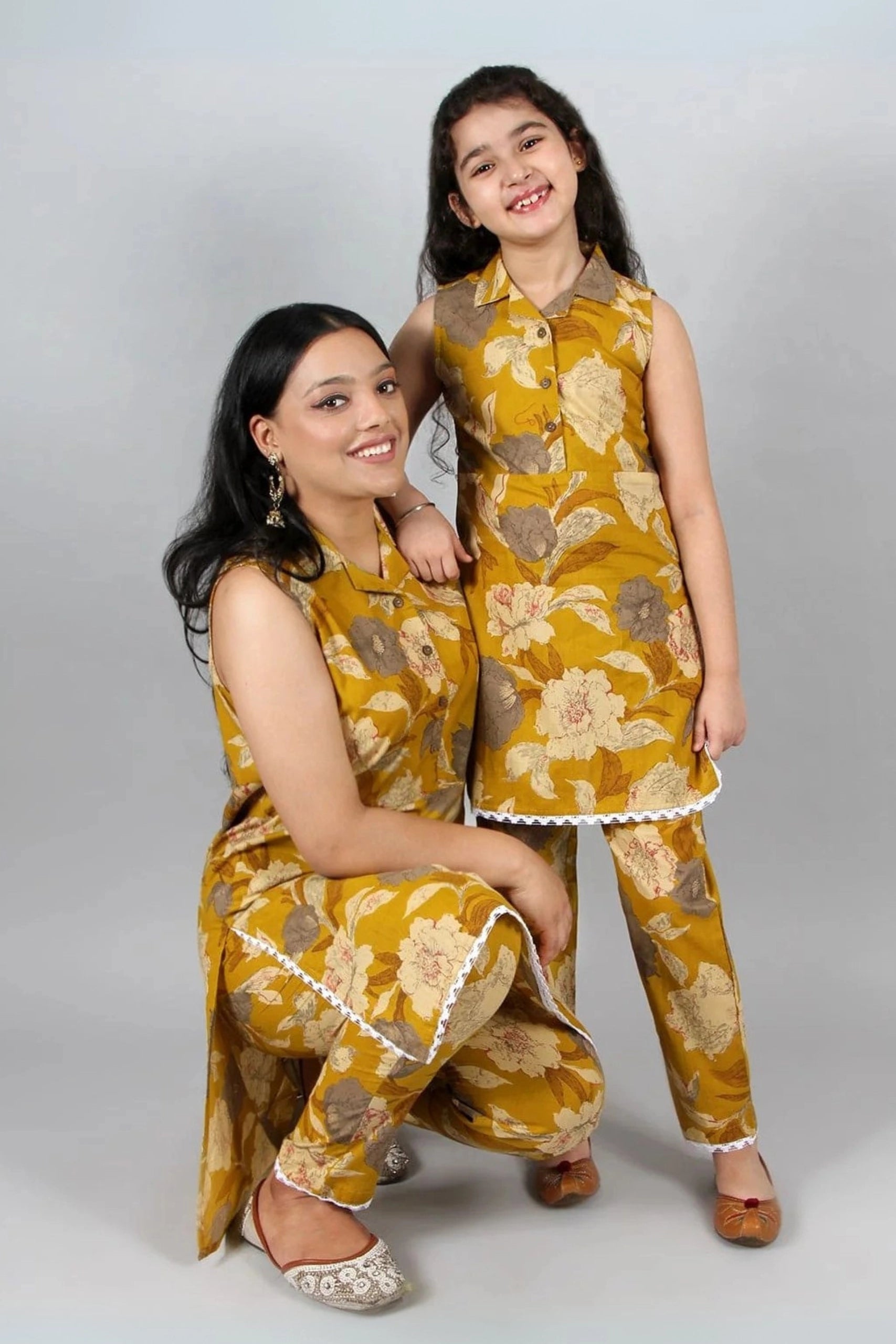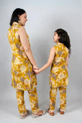 Mustard Floral Print Suit Set For Mom And Daughter