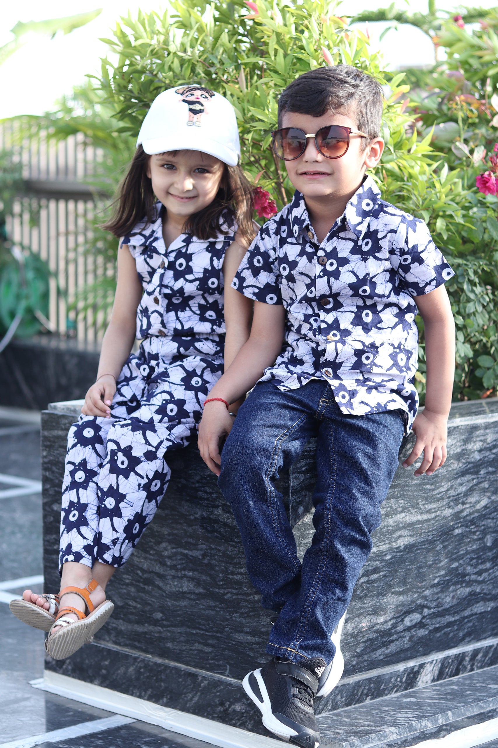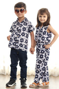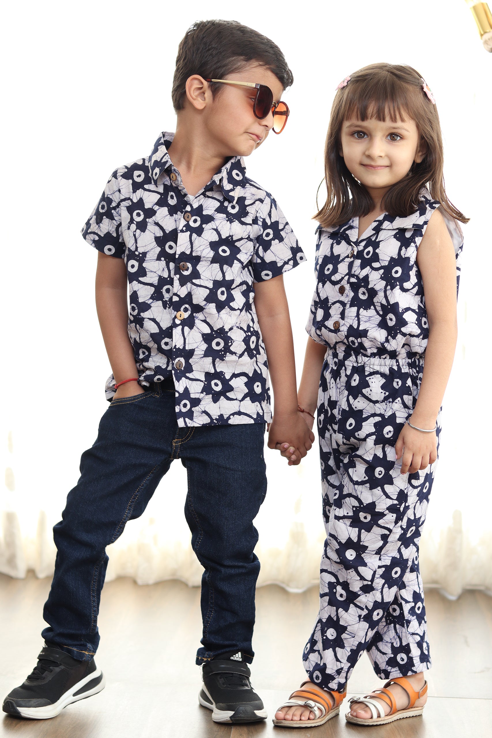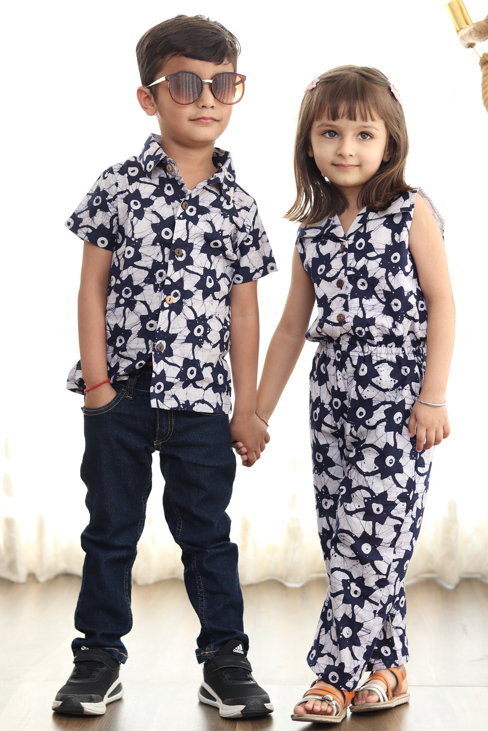 Navy Blue and White Printed Jumpsuit with Shirt Brother & Sister Twin Set