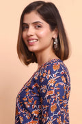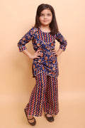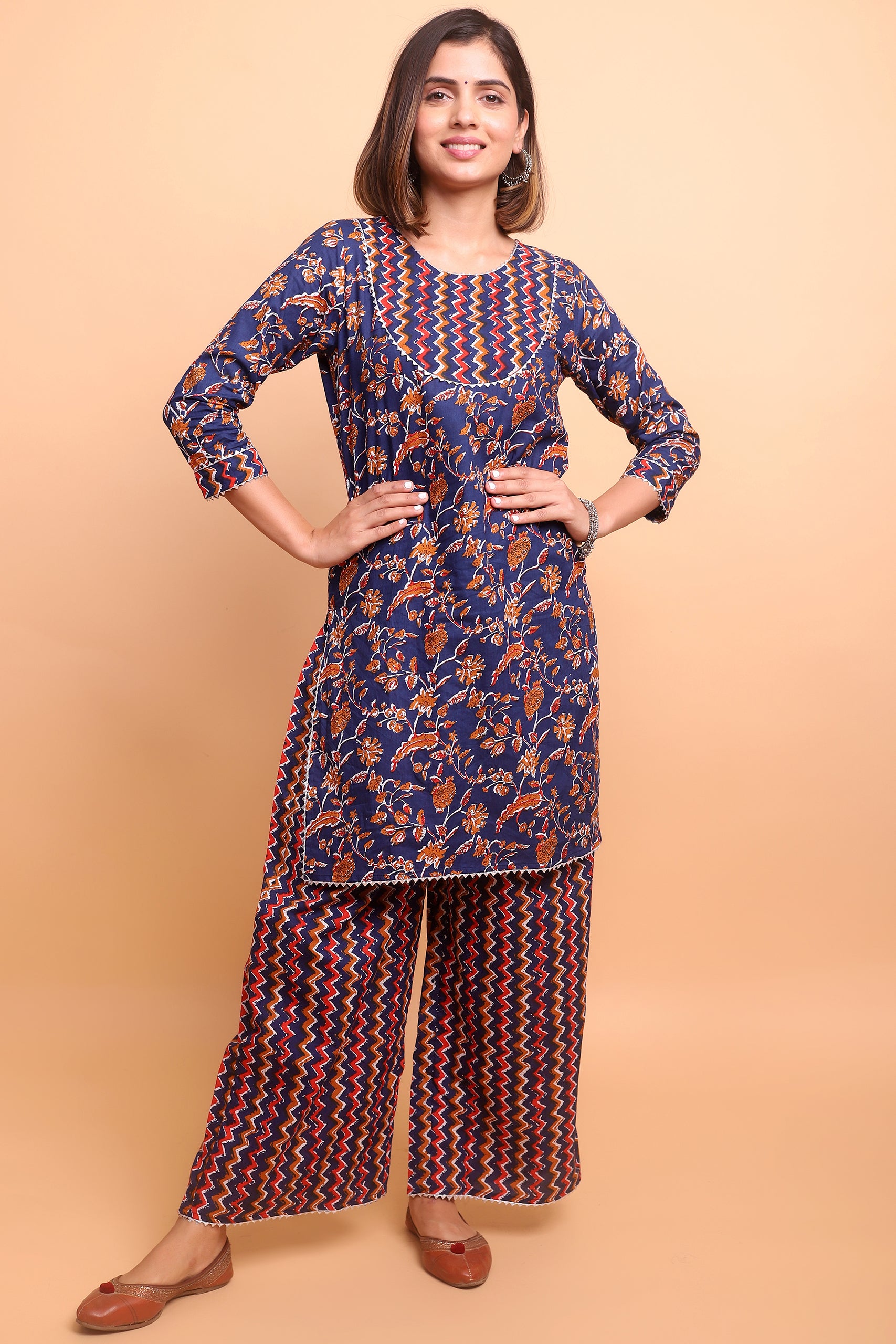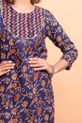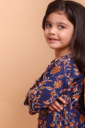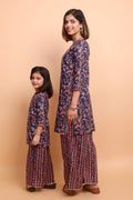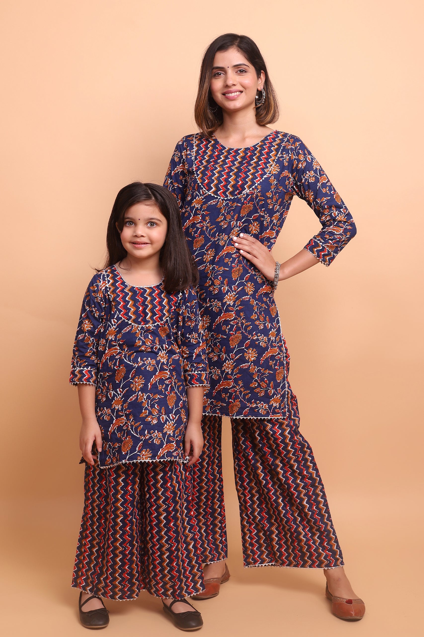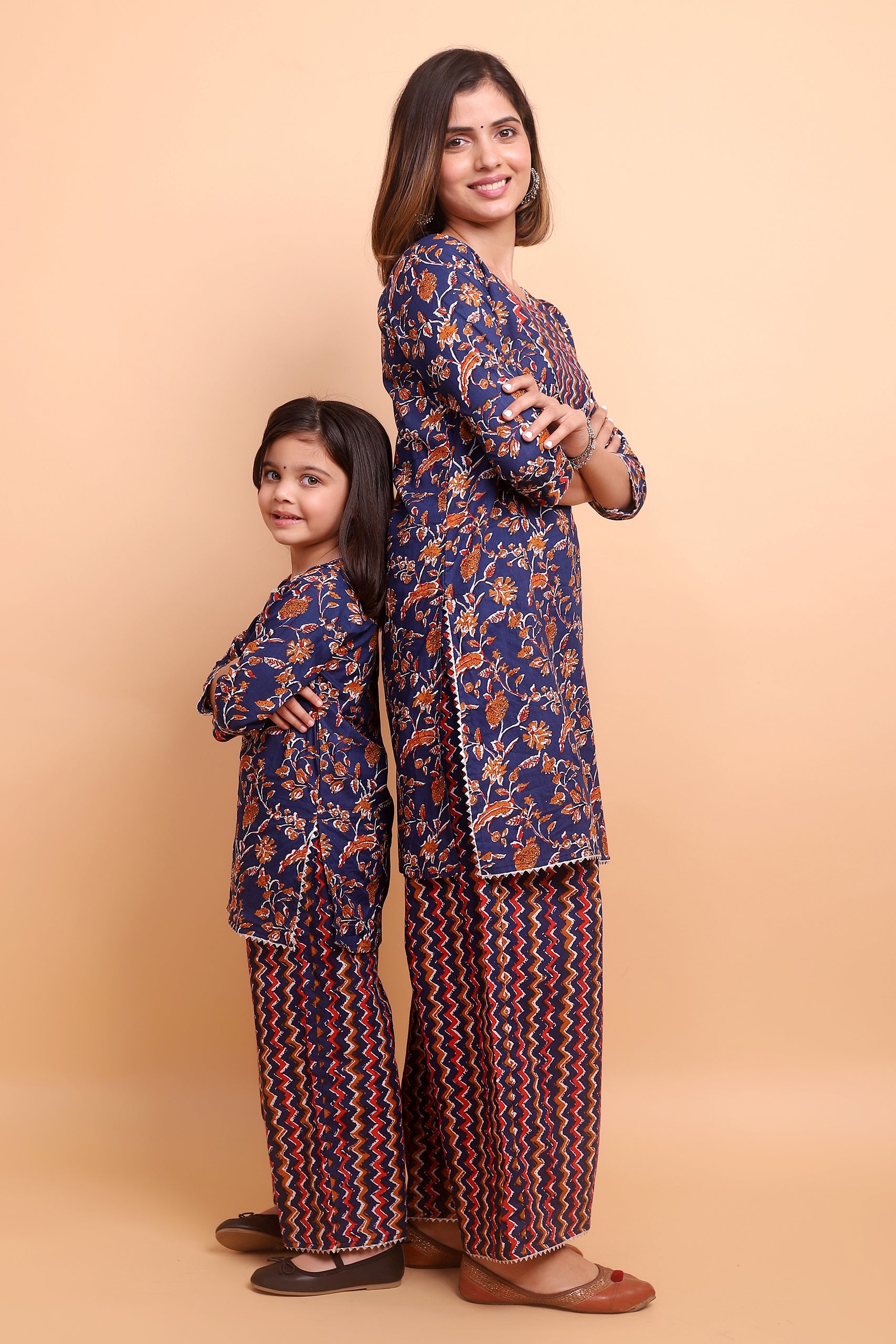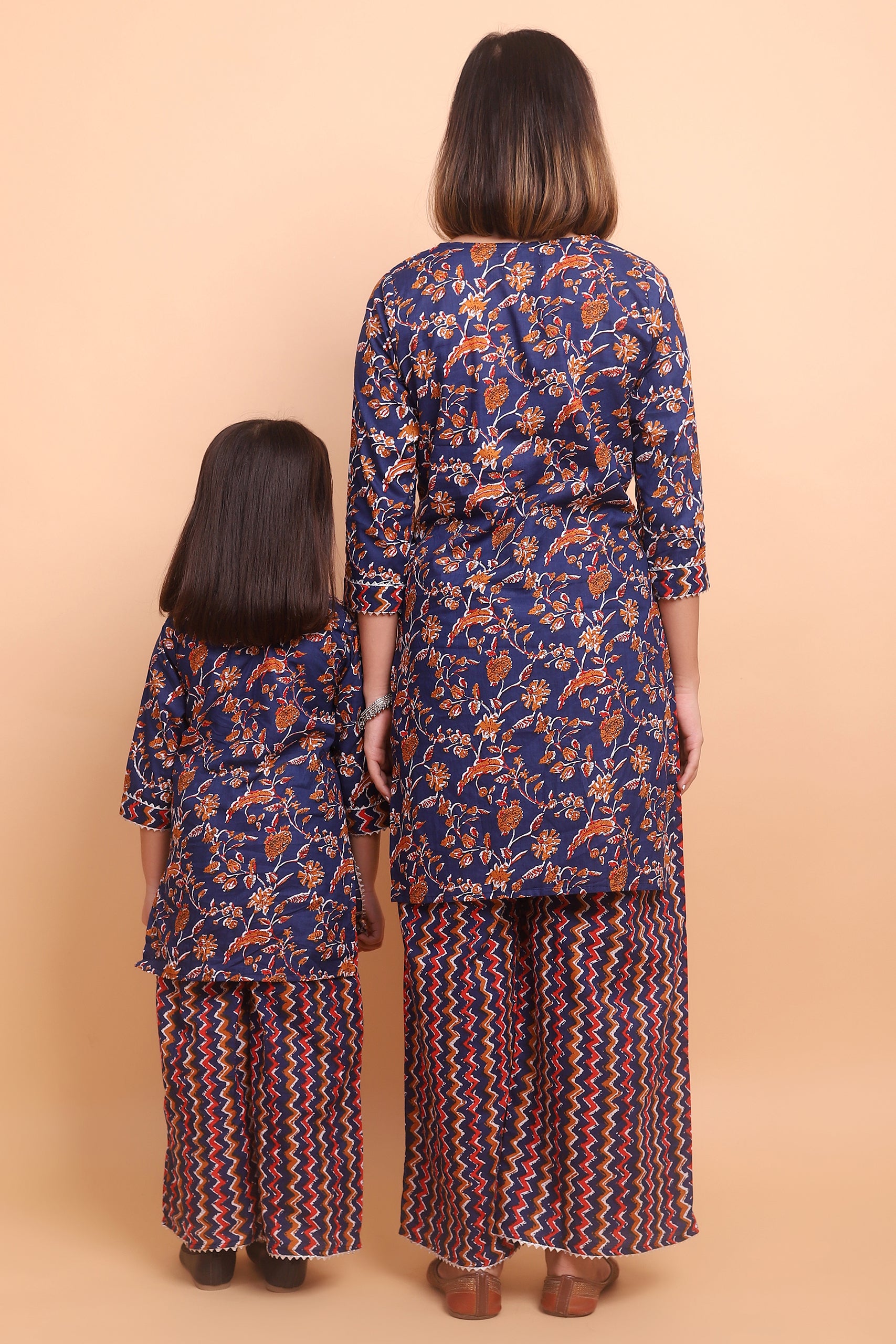 Navy Floral Printed Kurti with Pant Mom and Daughter Twin Set