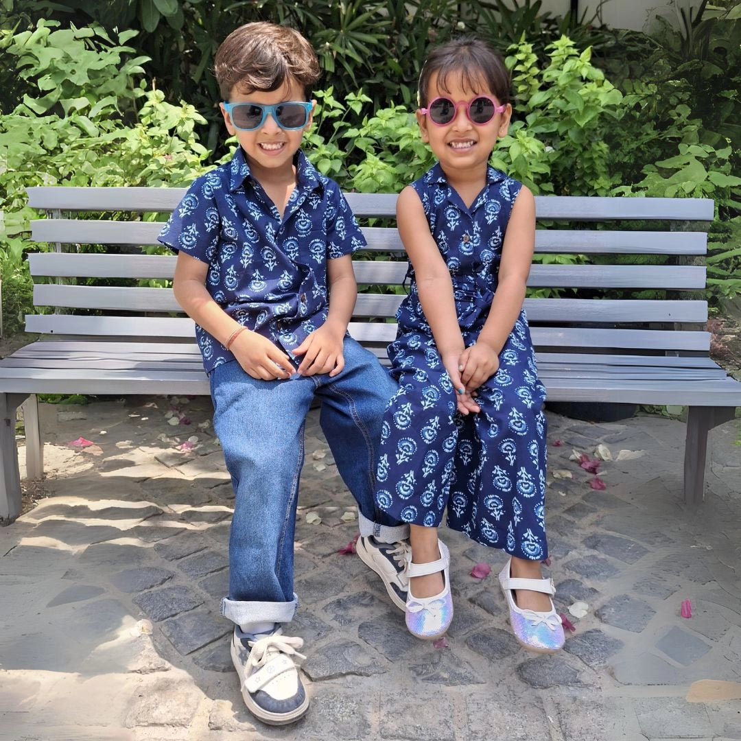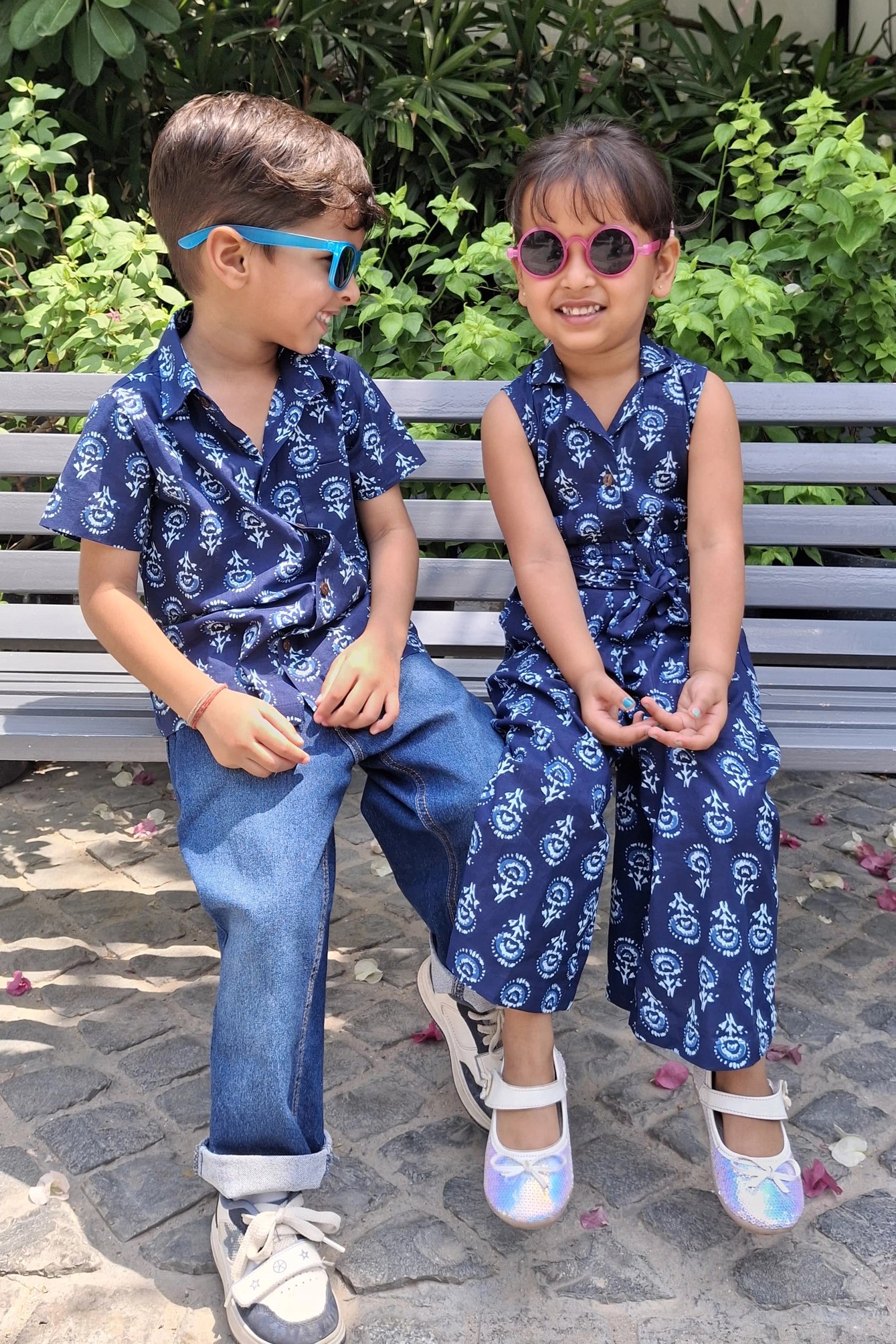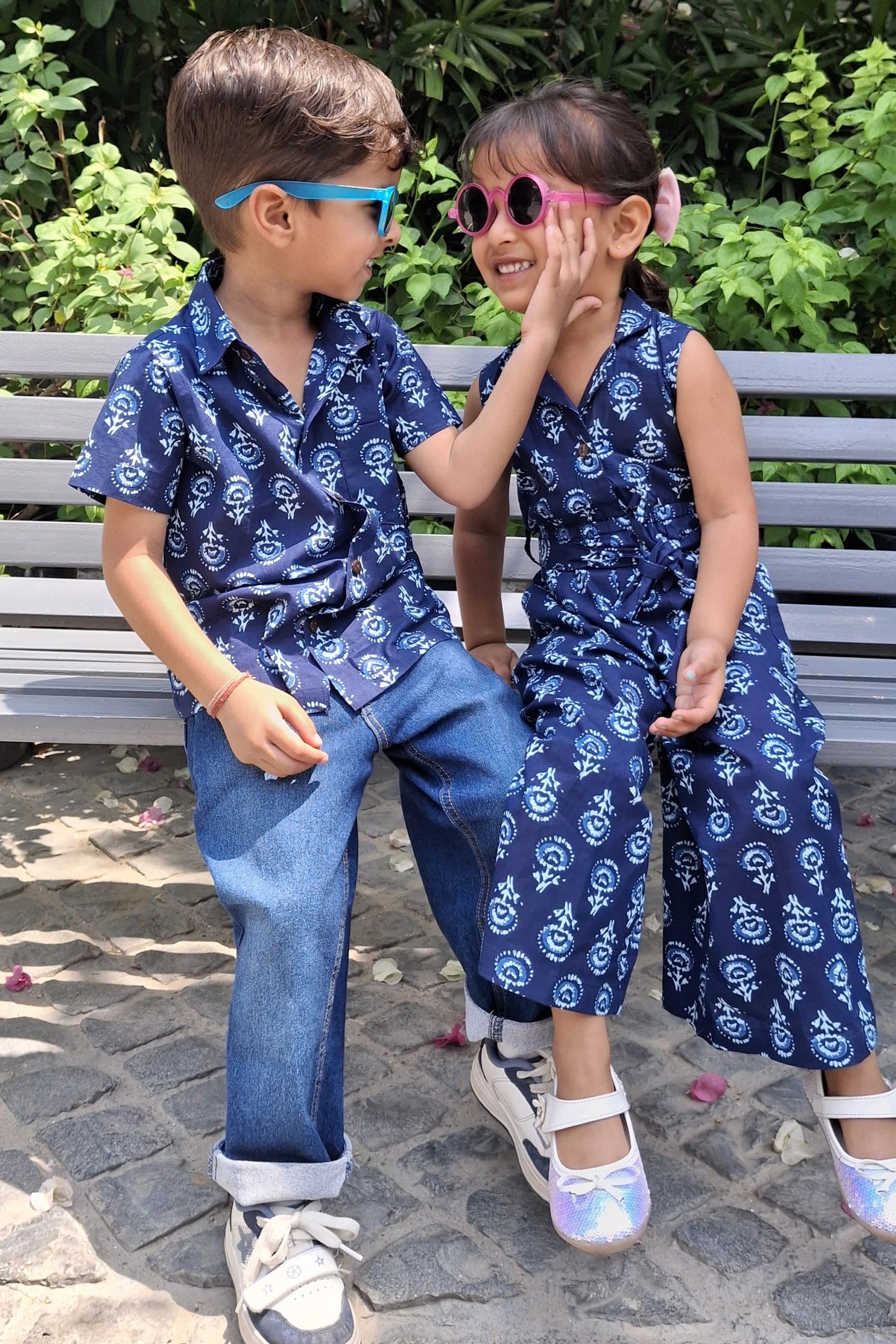 Navy Indigo Print Jumpsuit With Shirt Brother & Sister Twin Set