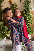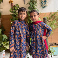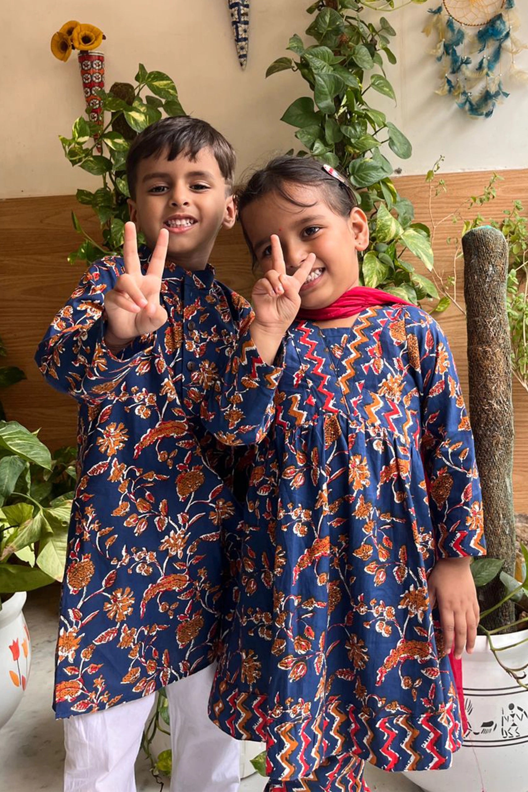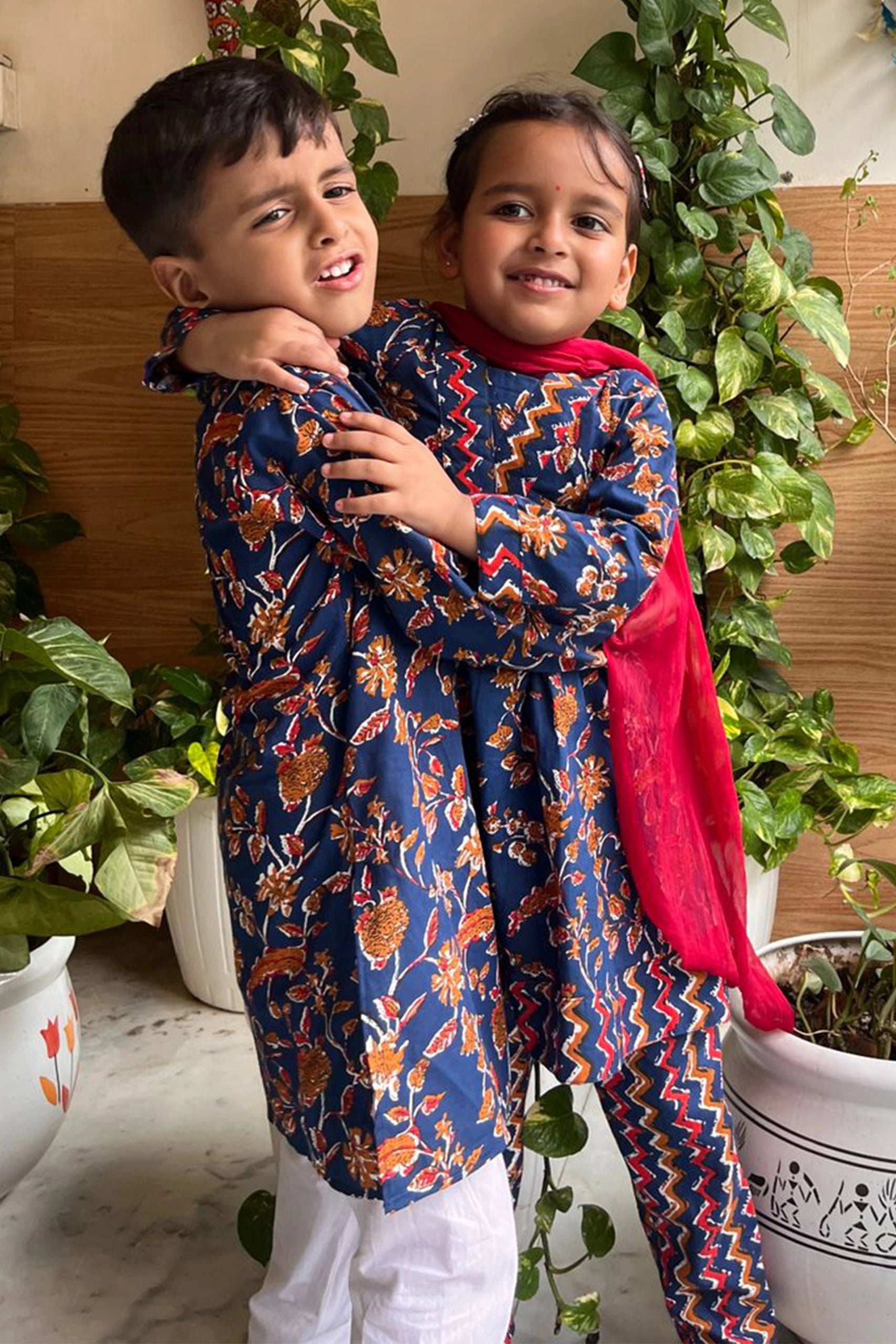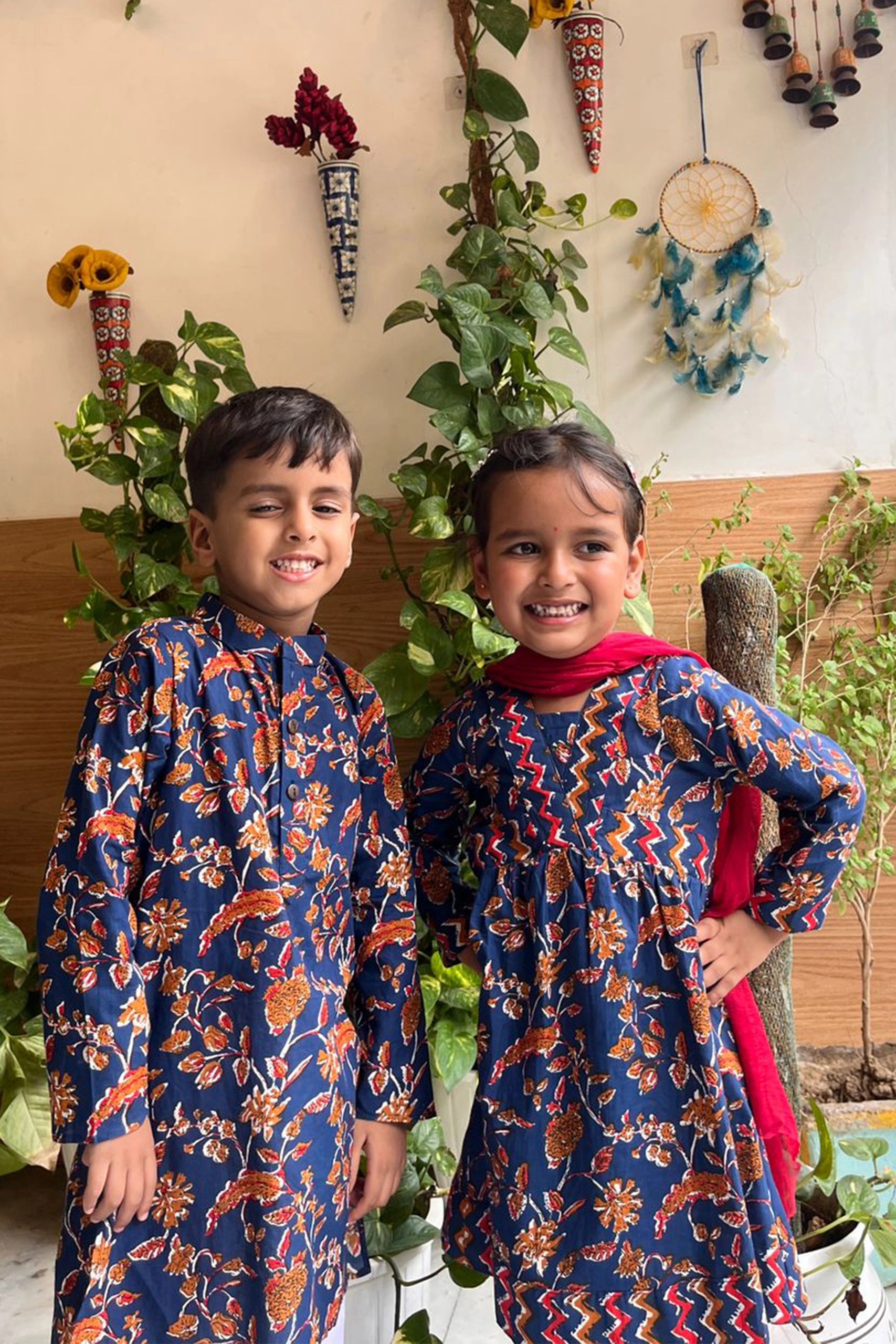 Navy Blue Printed Suit Set With Pants For Brother And Sister
