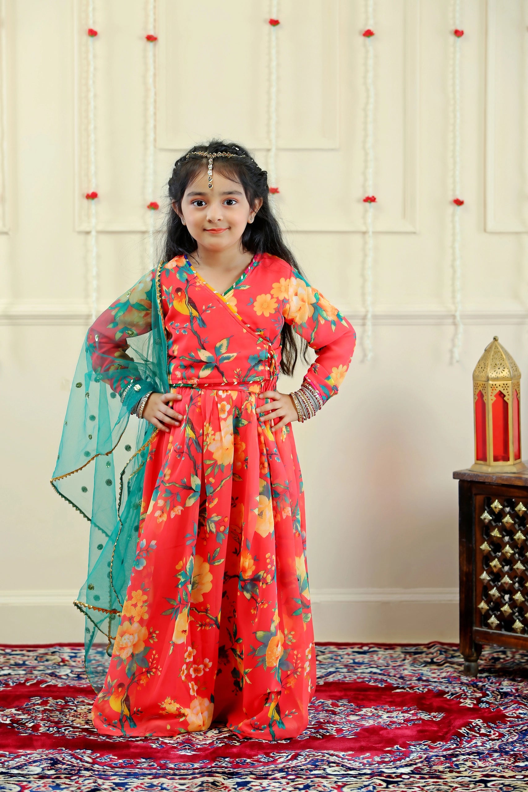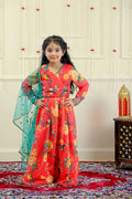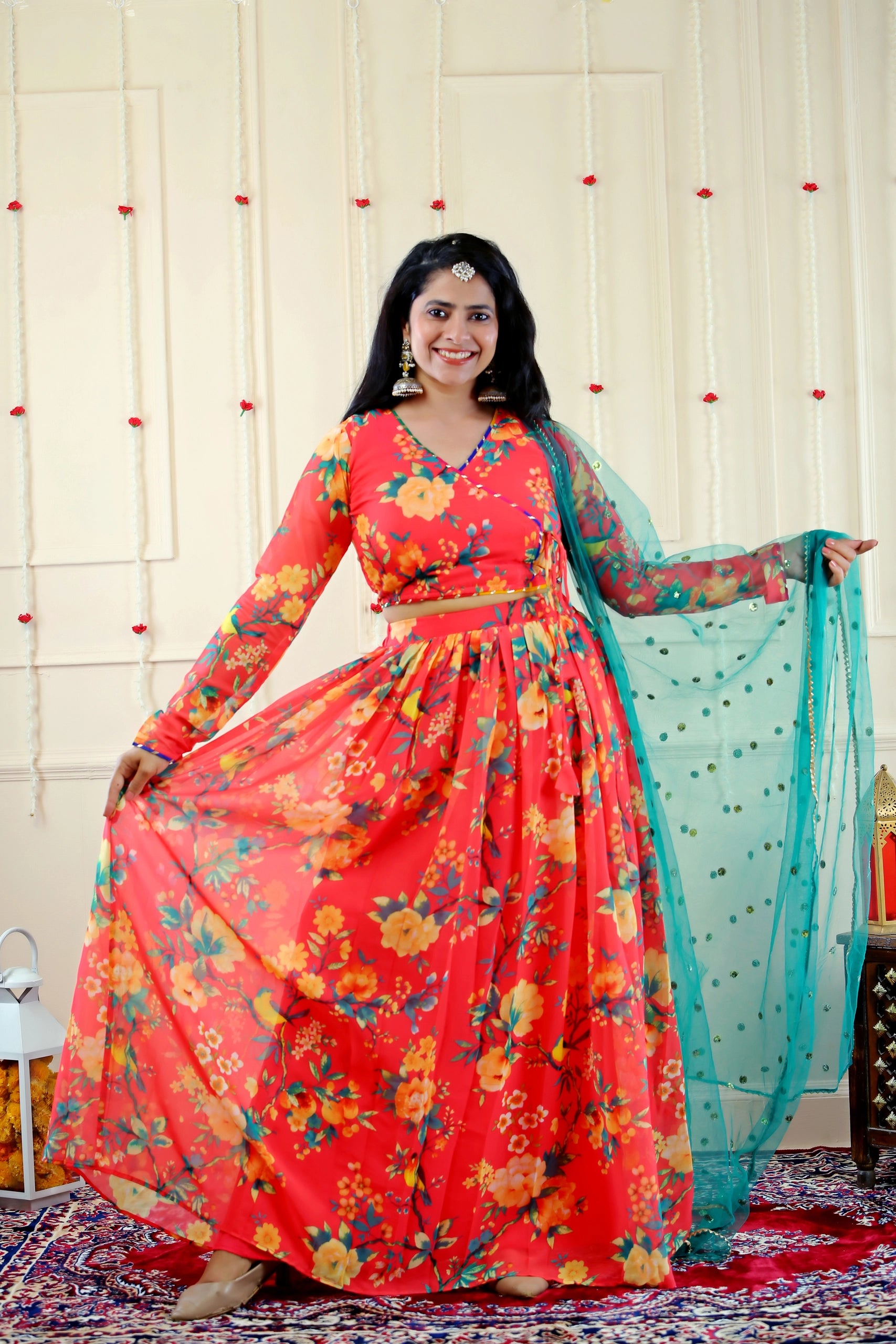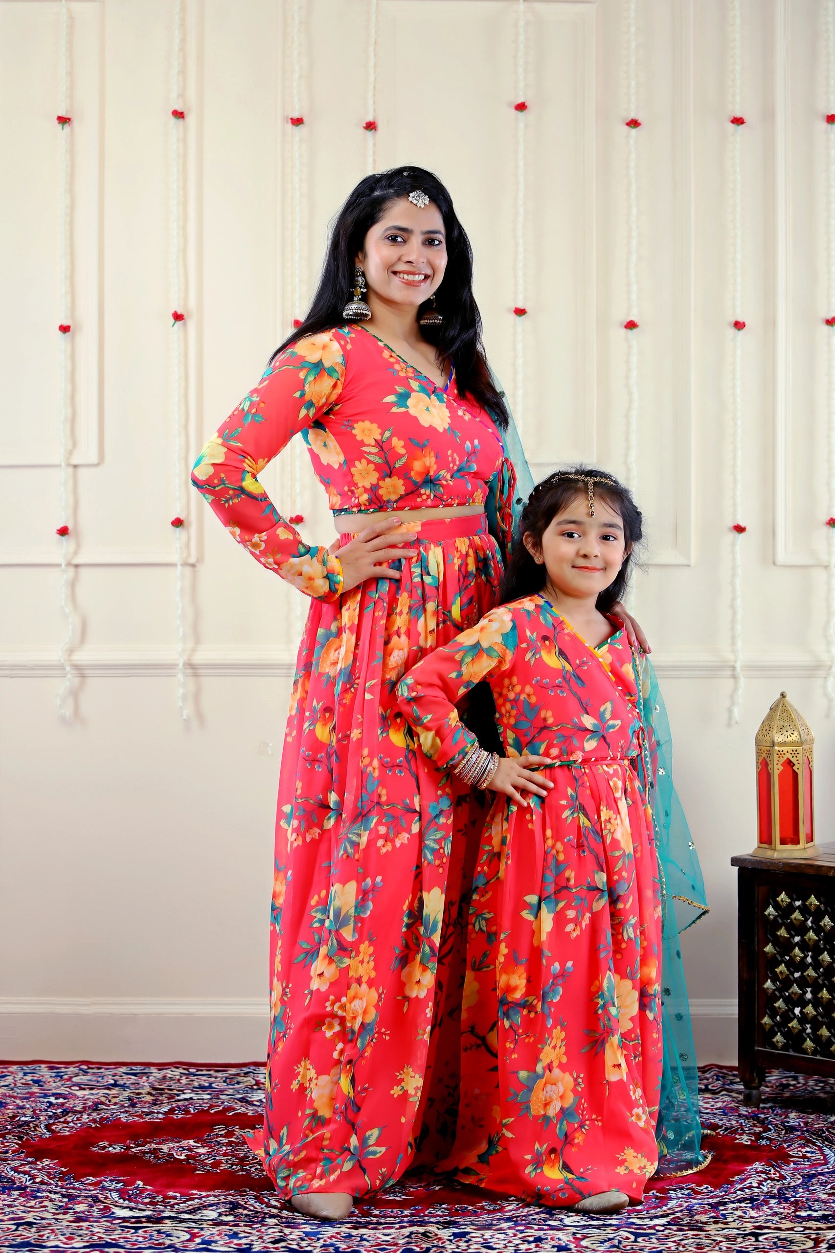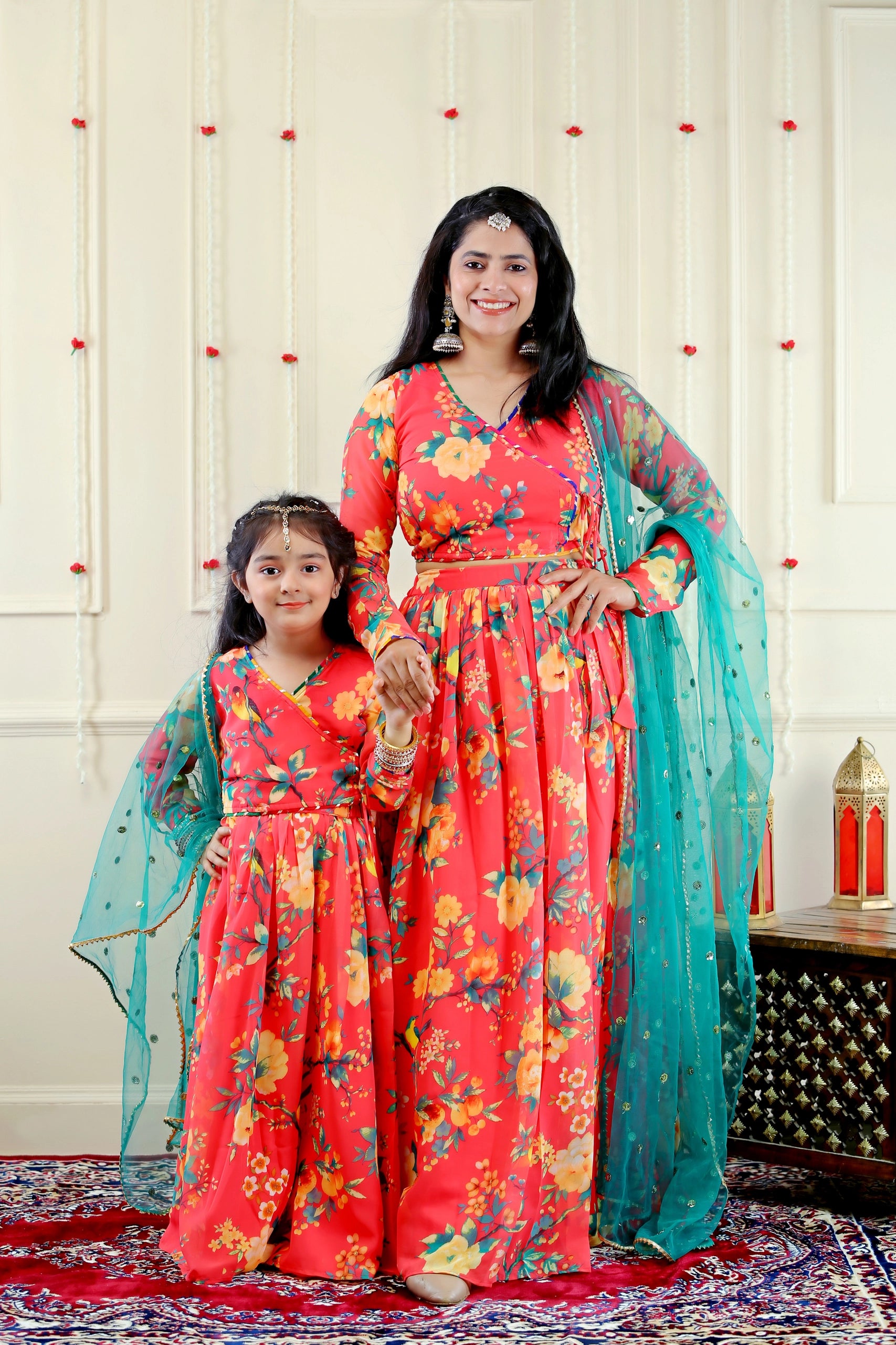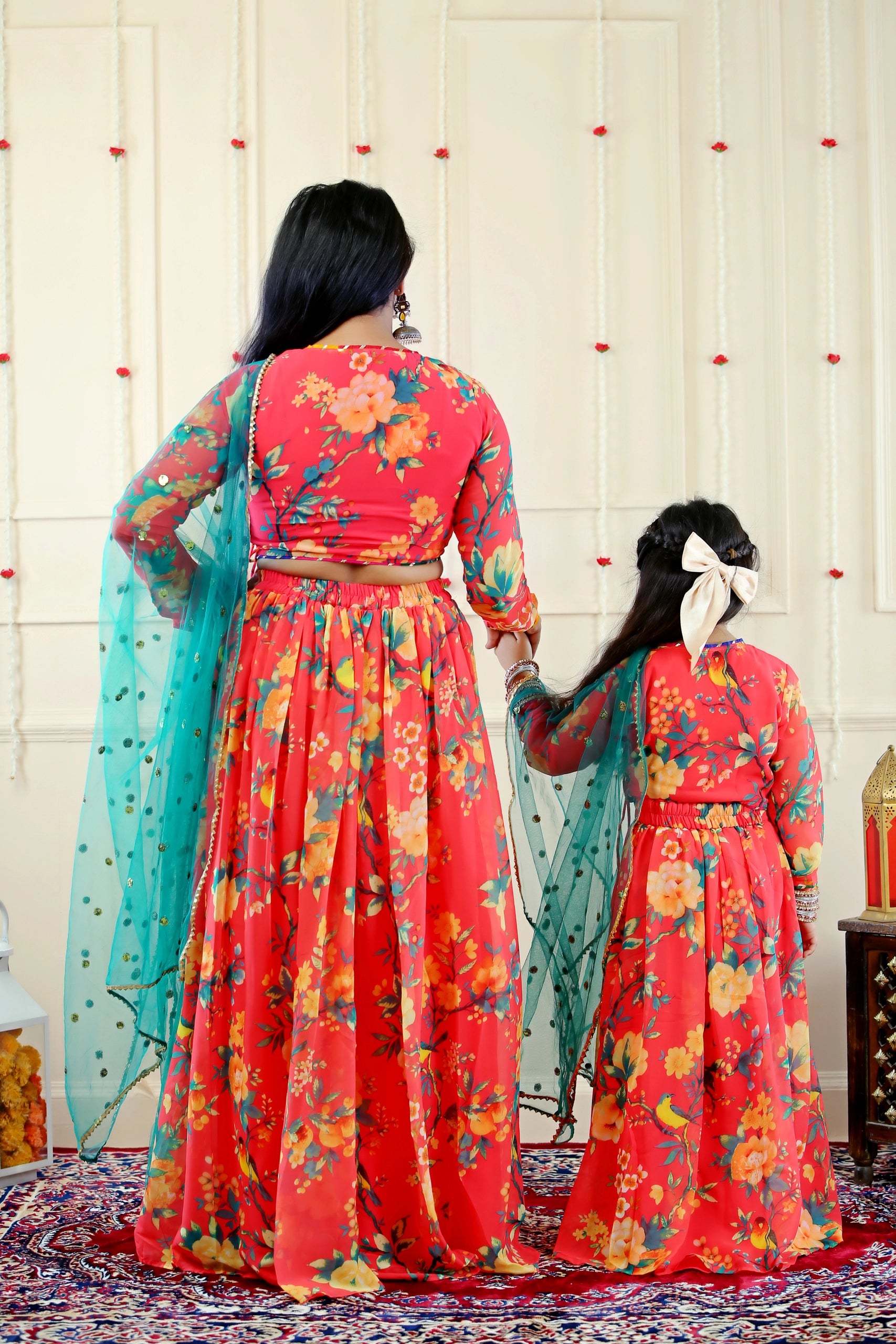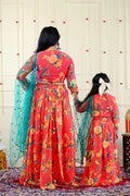Orange and Yellow Floral Crop Top with Skirt and Dupatta ( Mom and Daughter Twin Set)