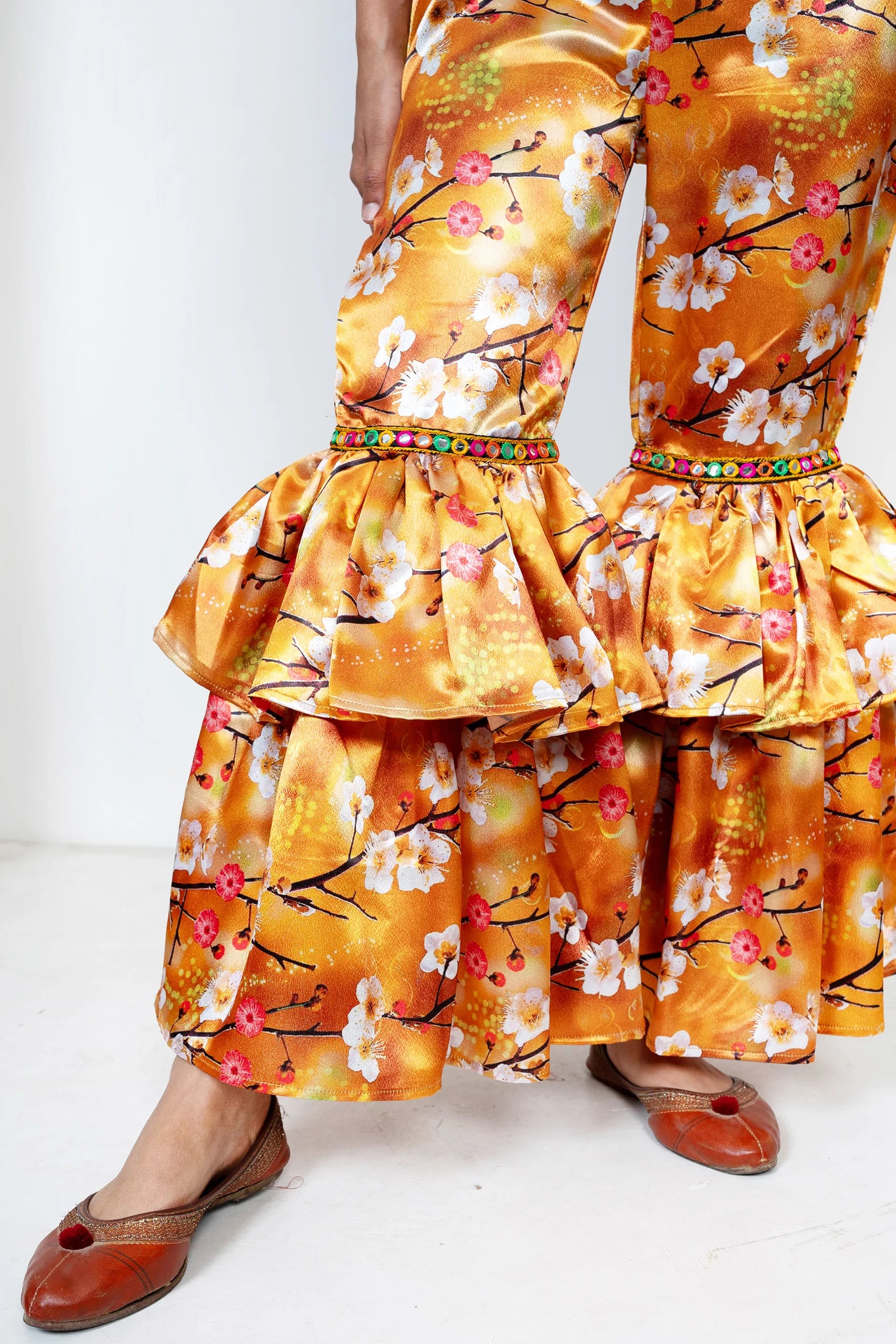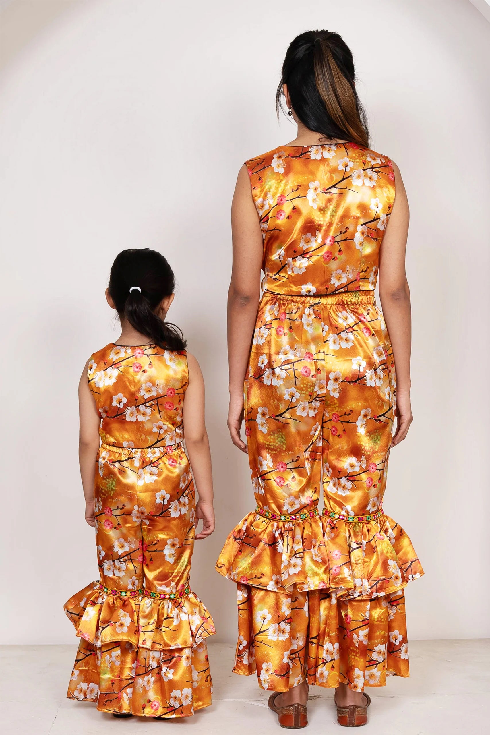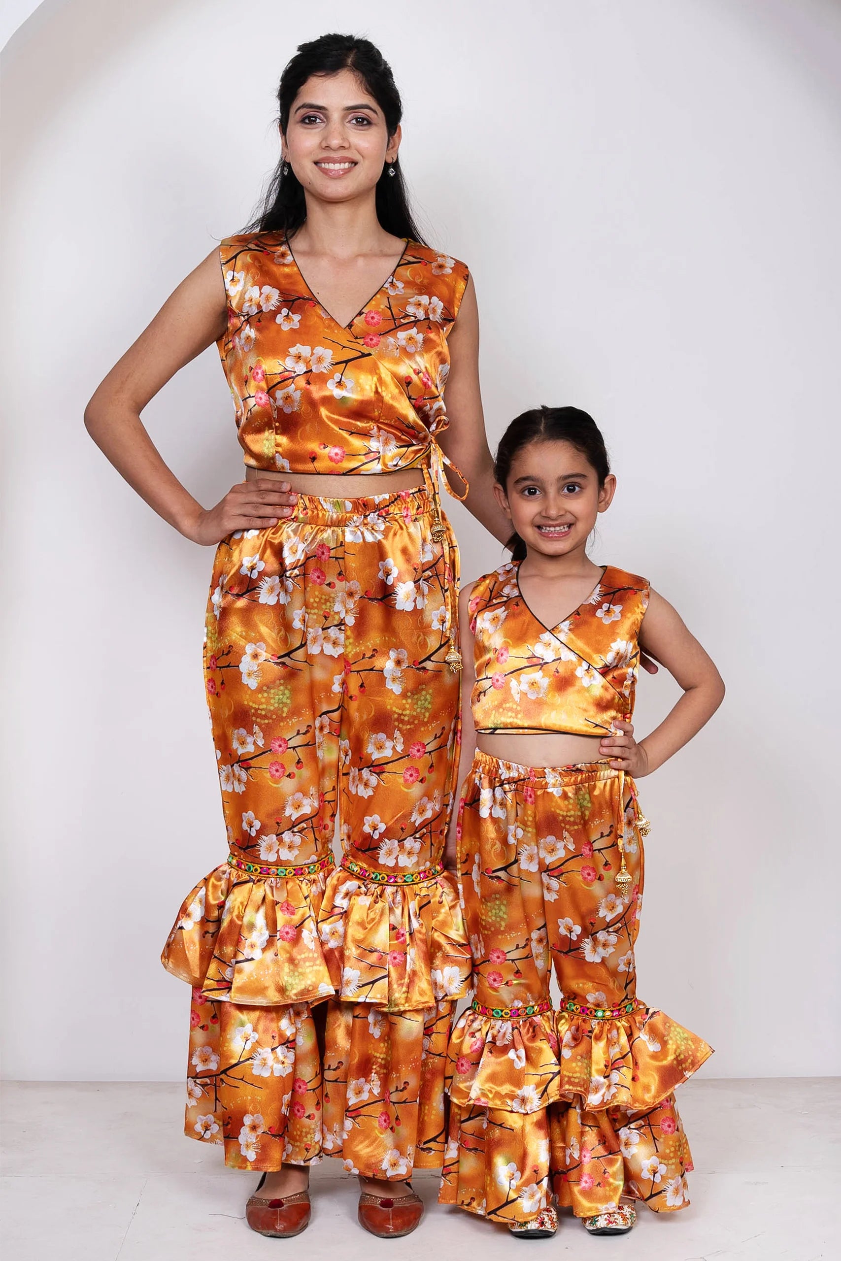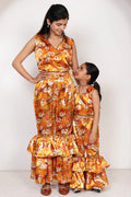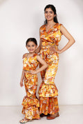 Orange Floral Printed Crop Top with Ruffled Pants ( Mom and Daughter Twin Set )