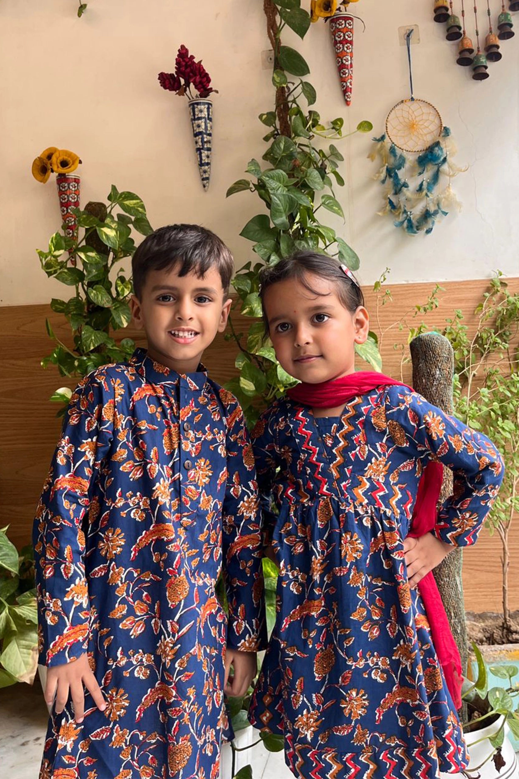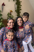Navy Printed Suit Set With Kurta And Pajama For Men (Family Set)