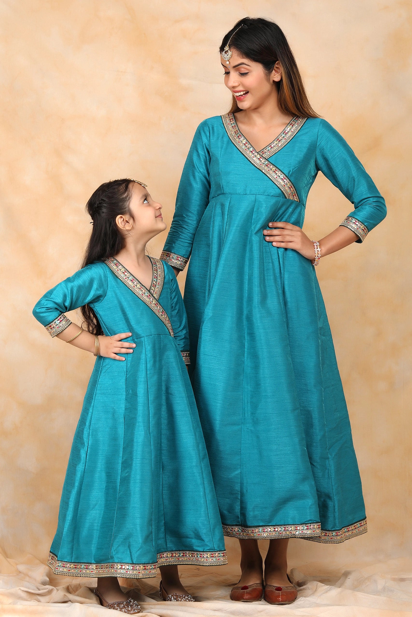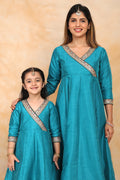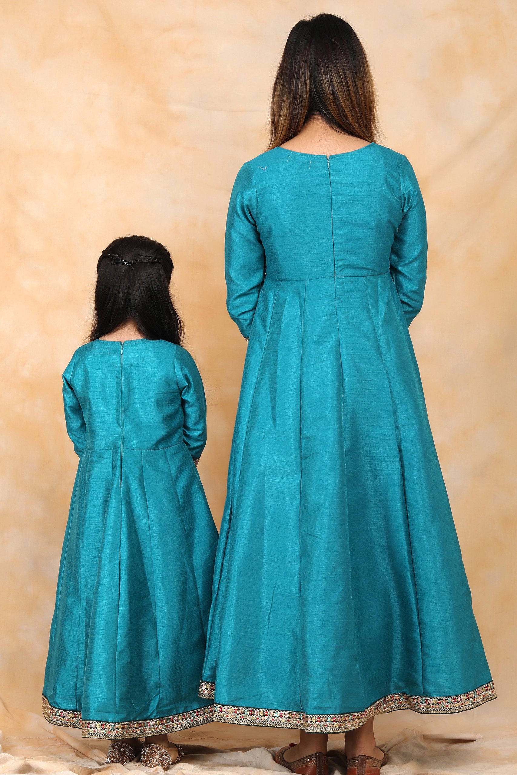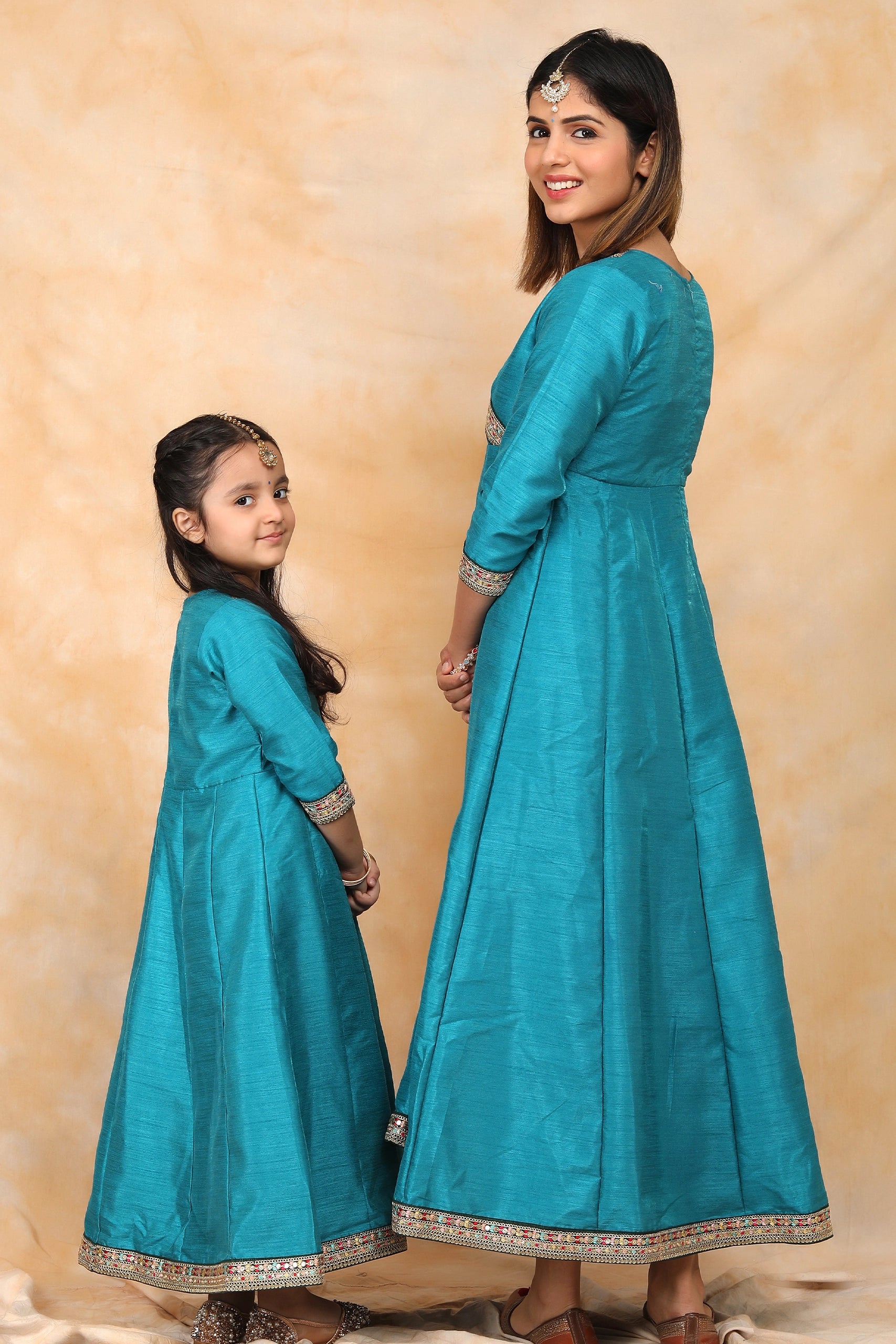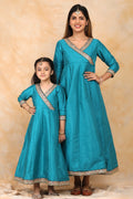 Exquisite Peacock Blue Ethnic Silk Gown Set for Mom and Daughter – Perfectly Coordinated Twin Outfits