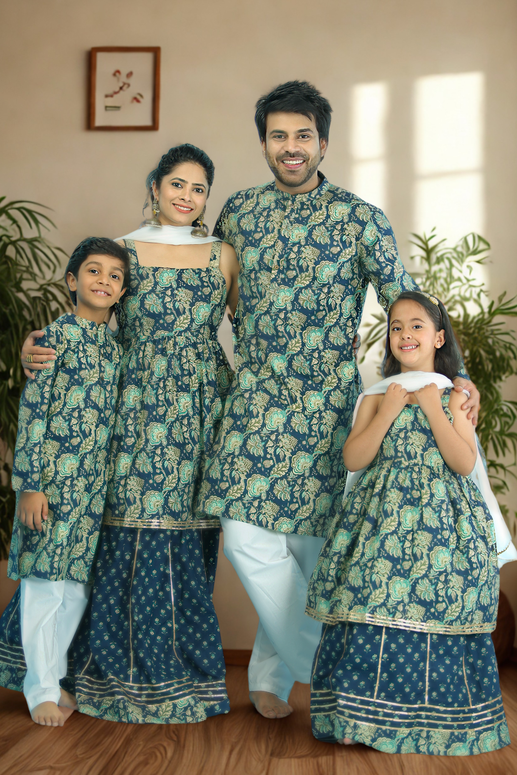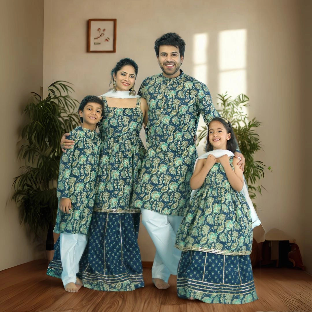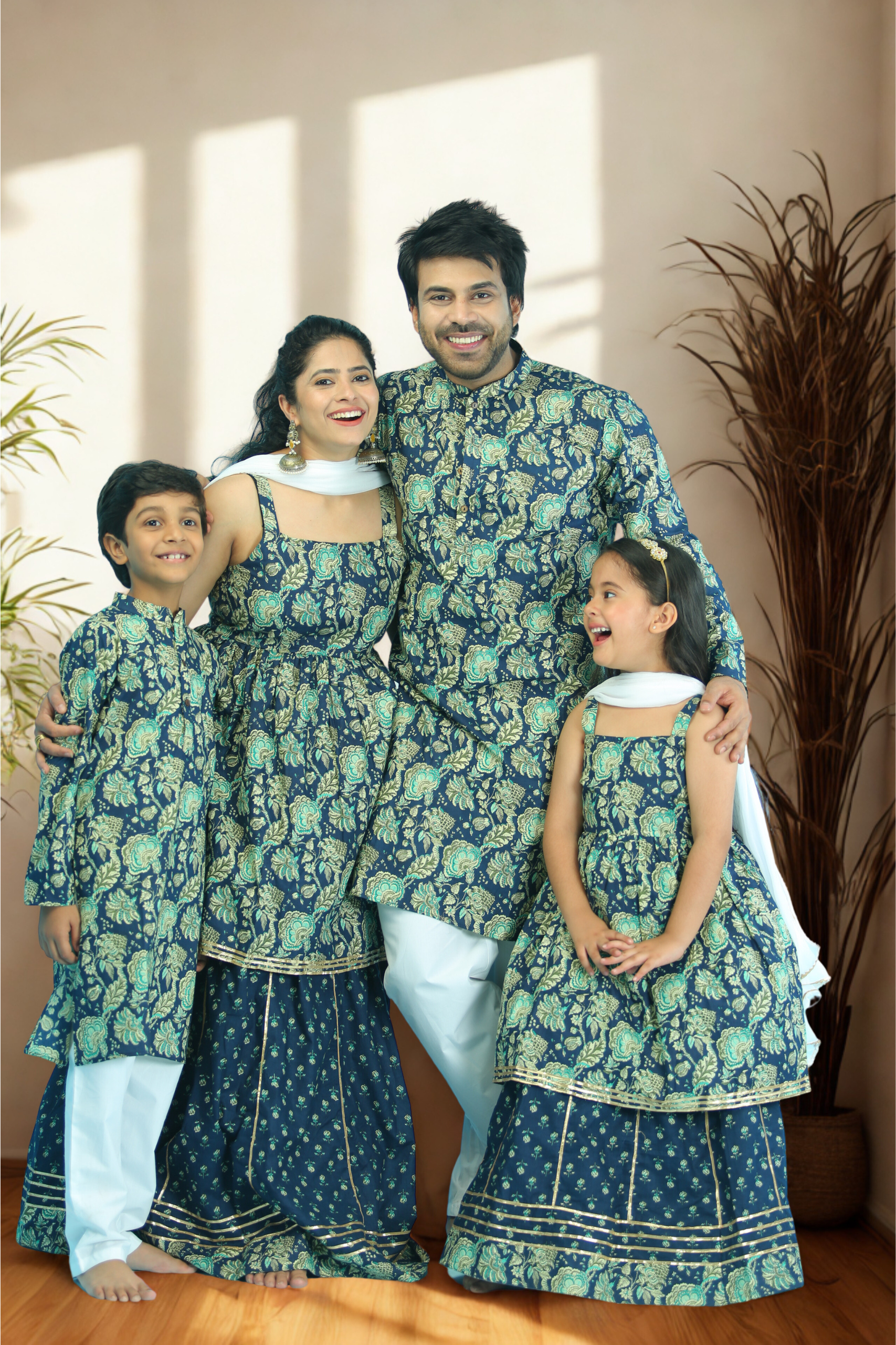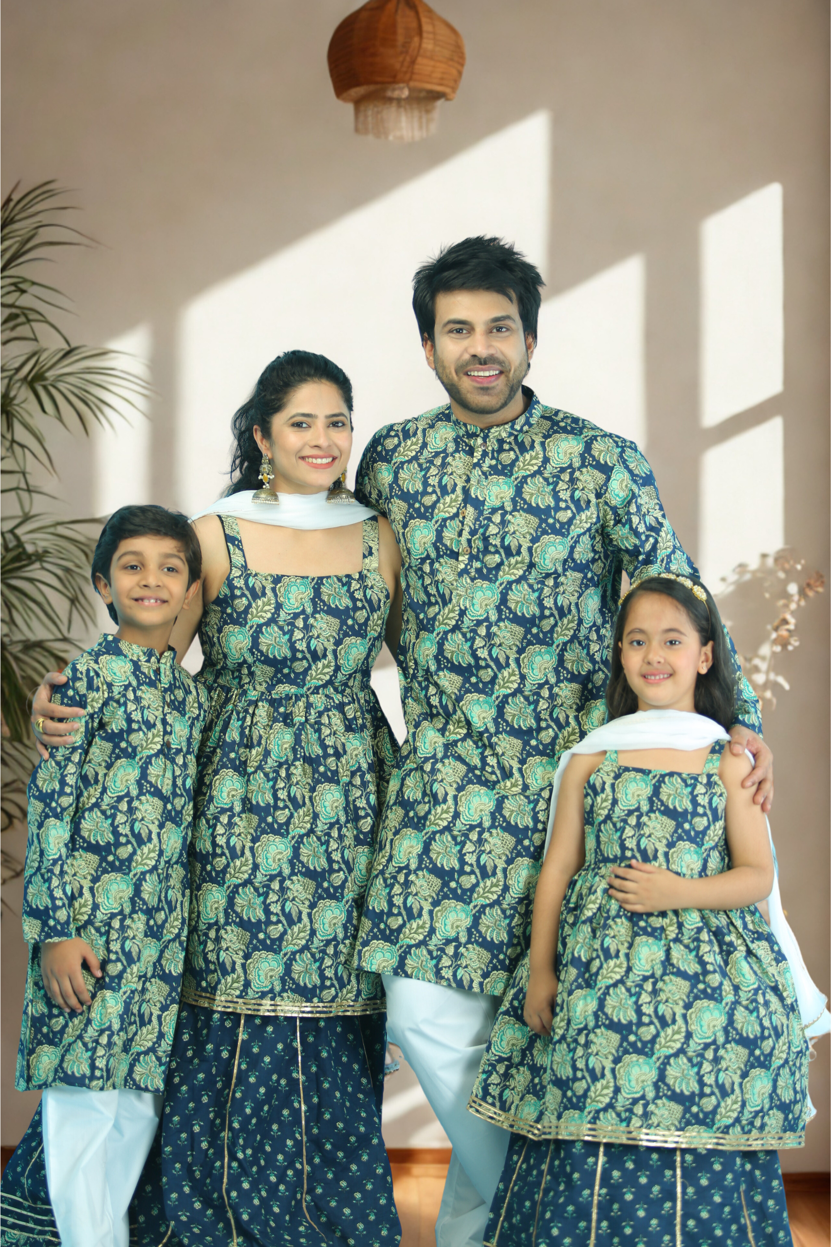 Navy Blue Peplum Top With Lehenga Set with Matching Kurta Pajama Family Twin Set