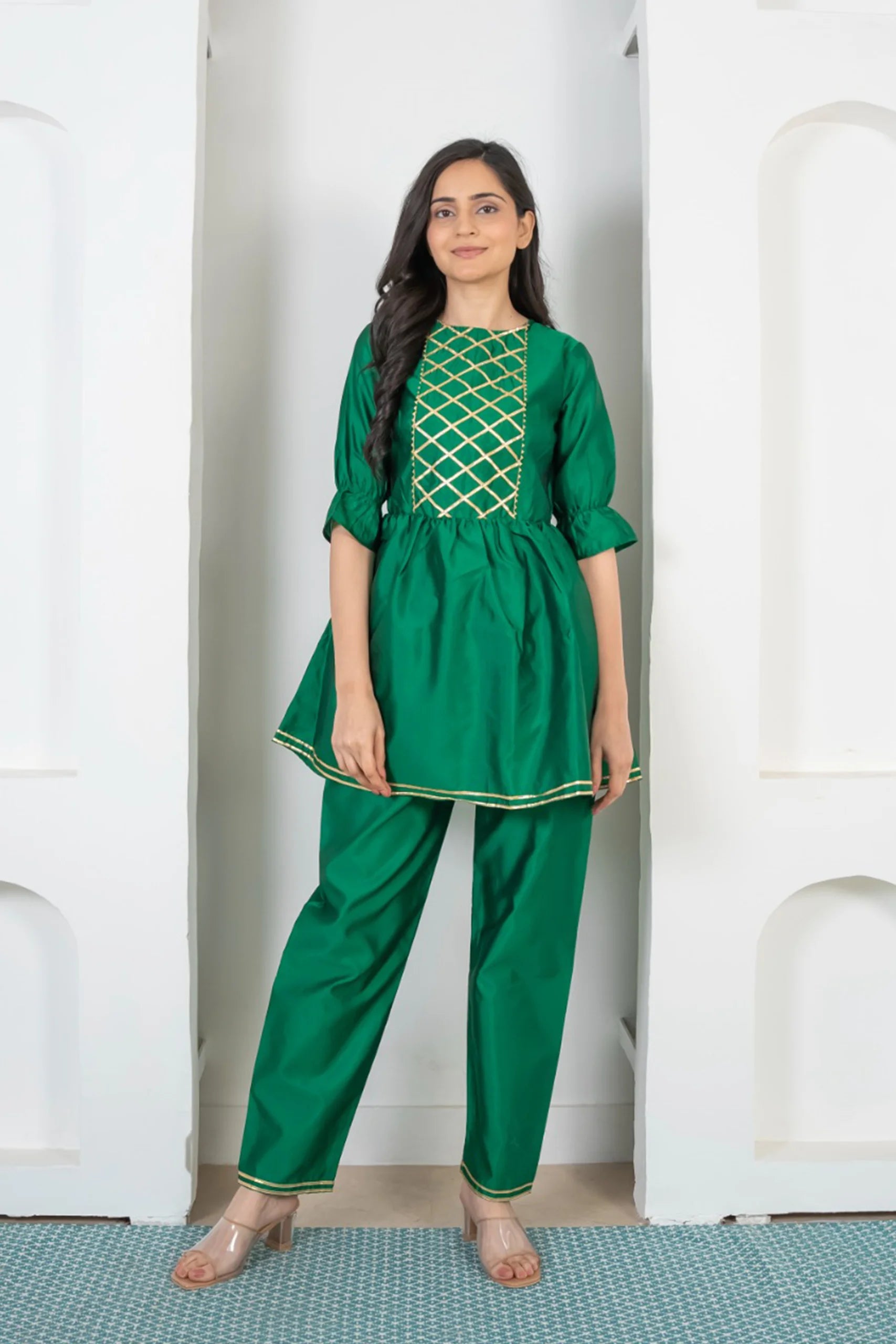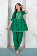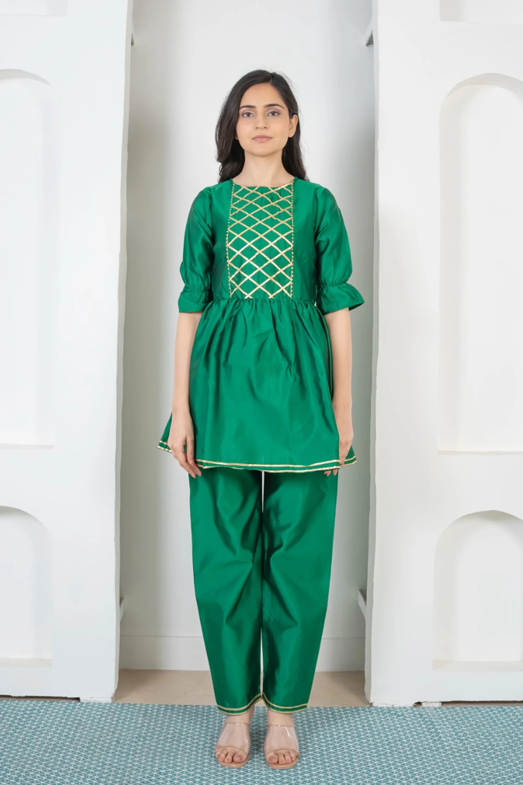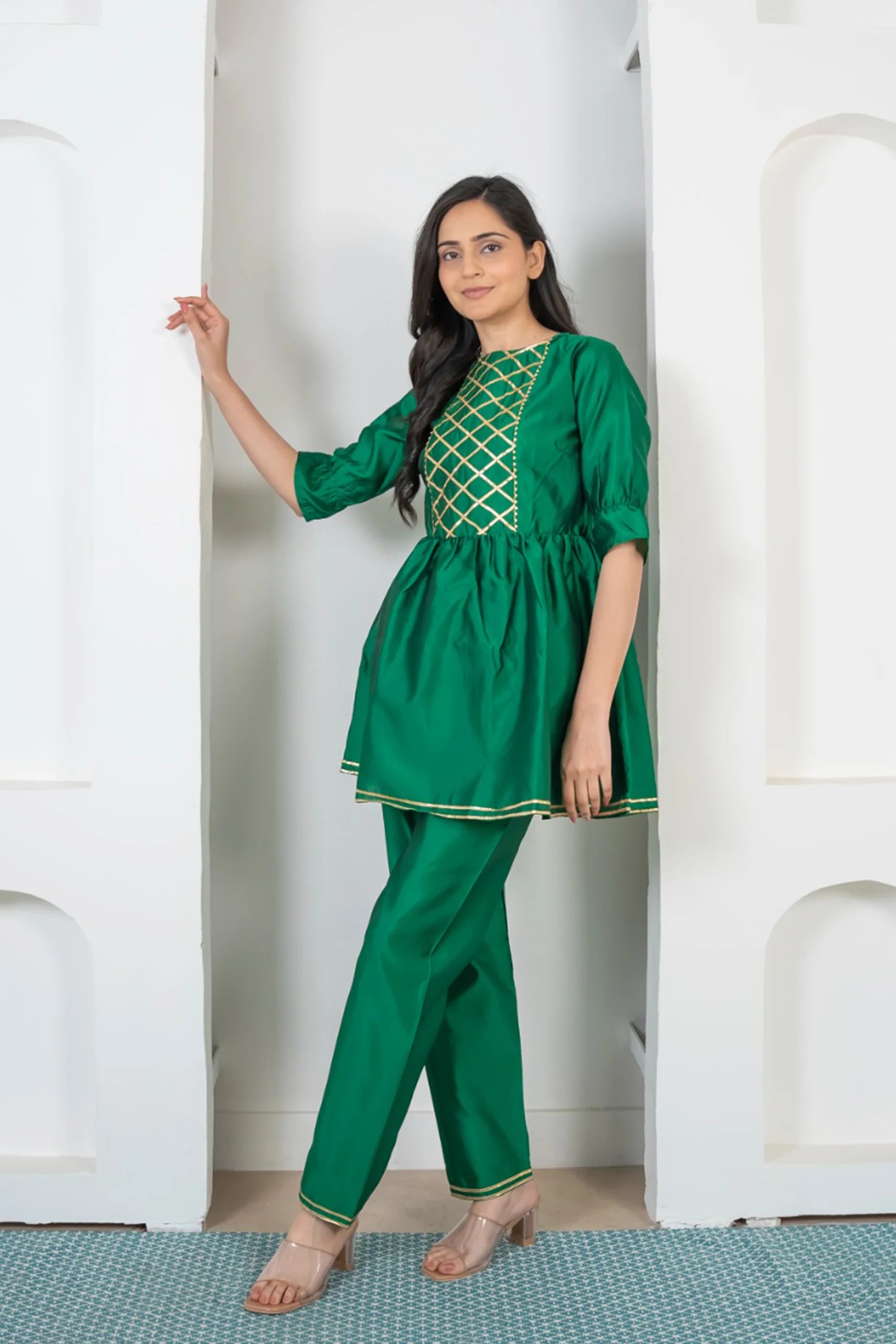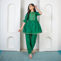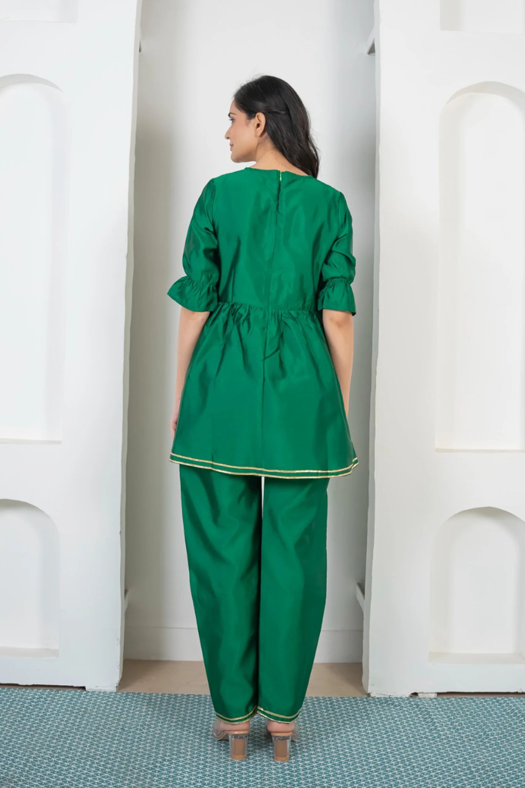 Refreshing Green and Golden Peplum Kurta with Pants For Women