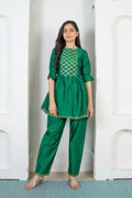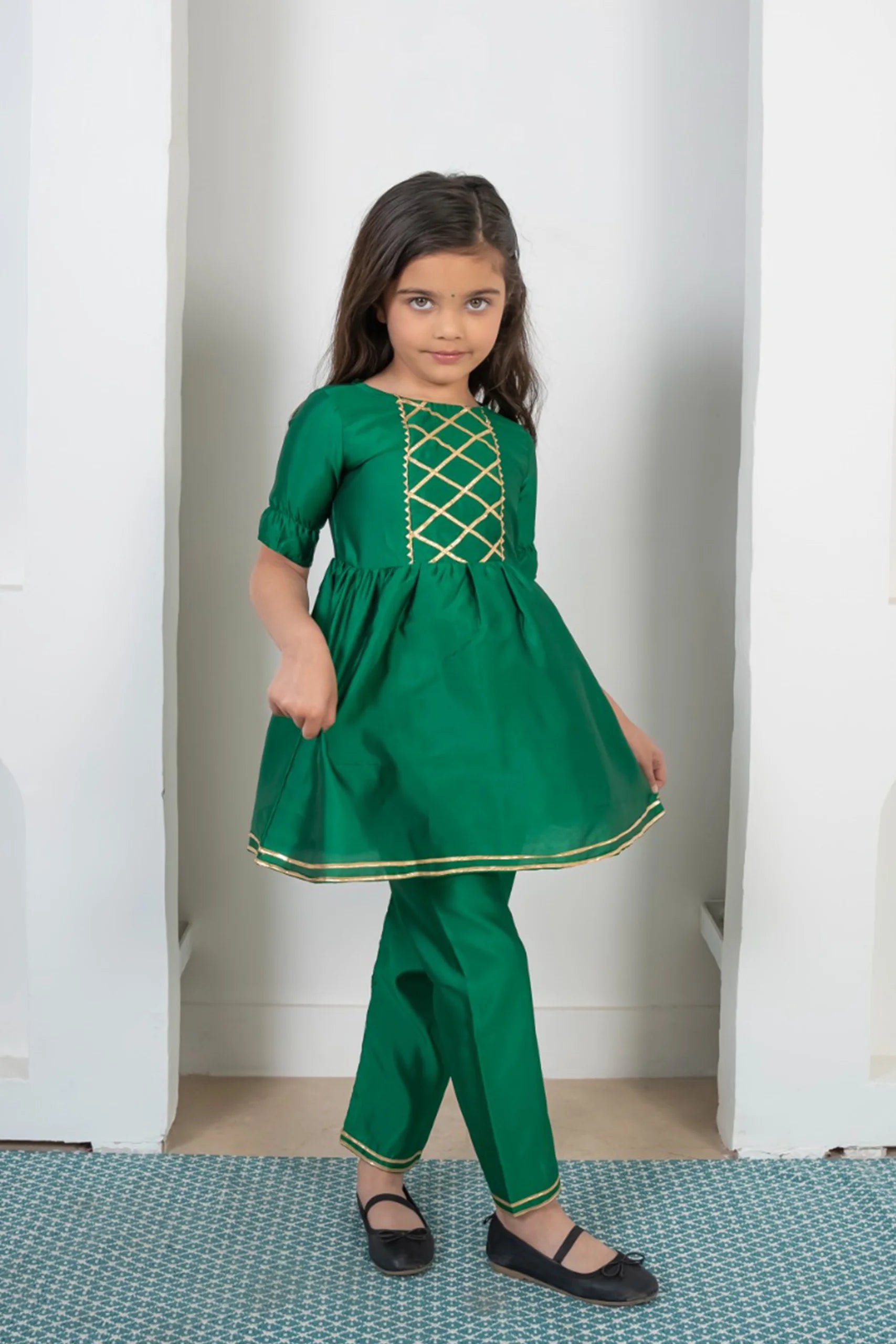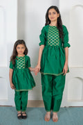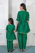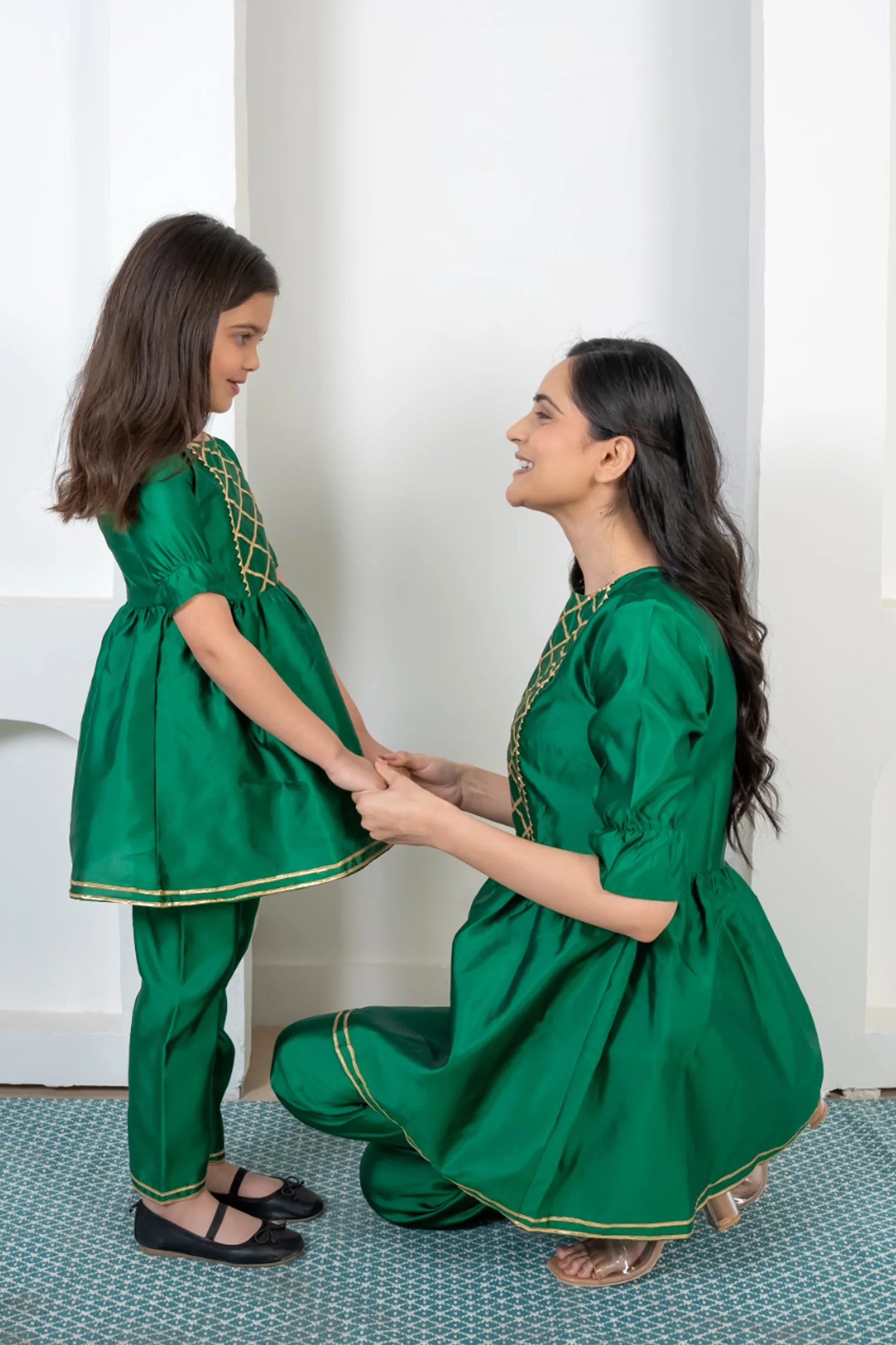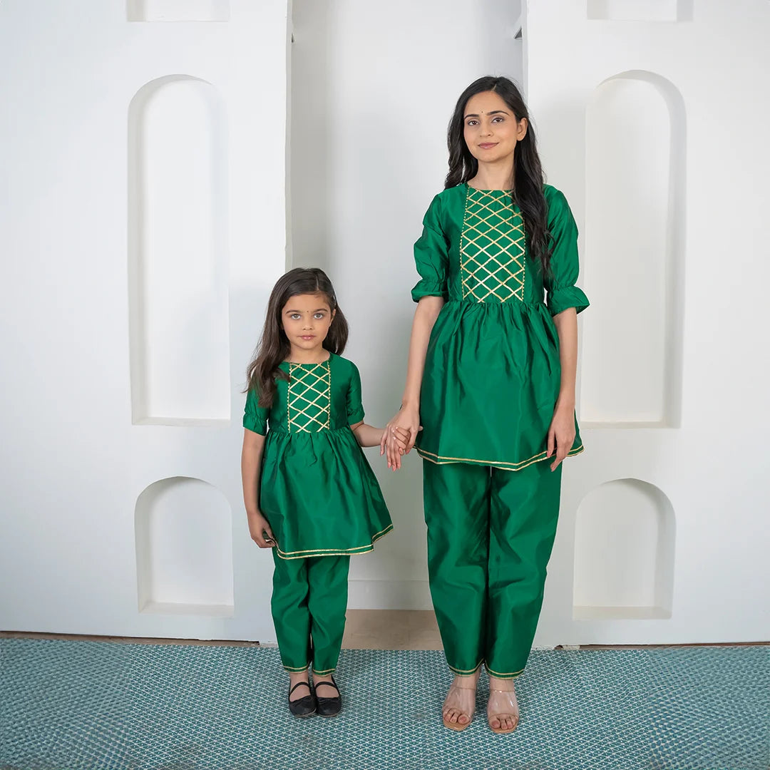 Refreshing Green and Golden Peplum Kurta with Pants For Mom and Daughter Twin Set