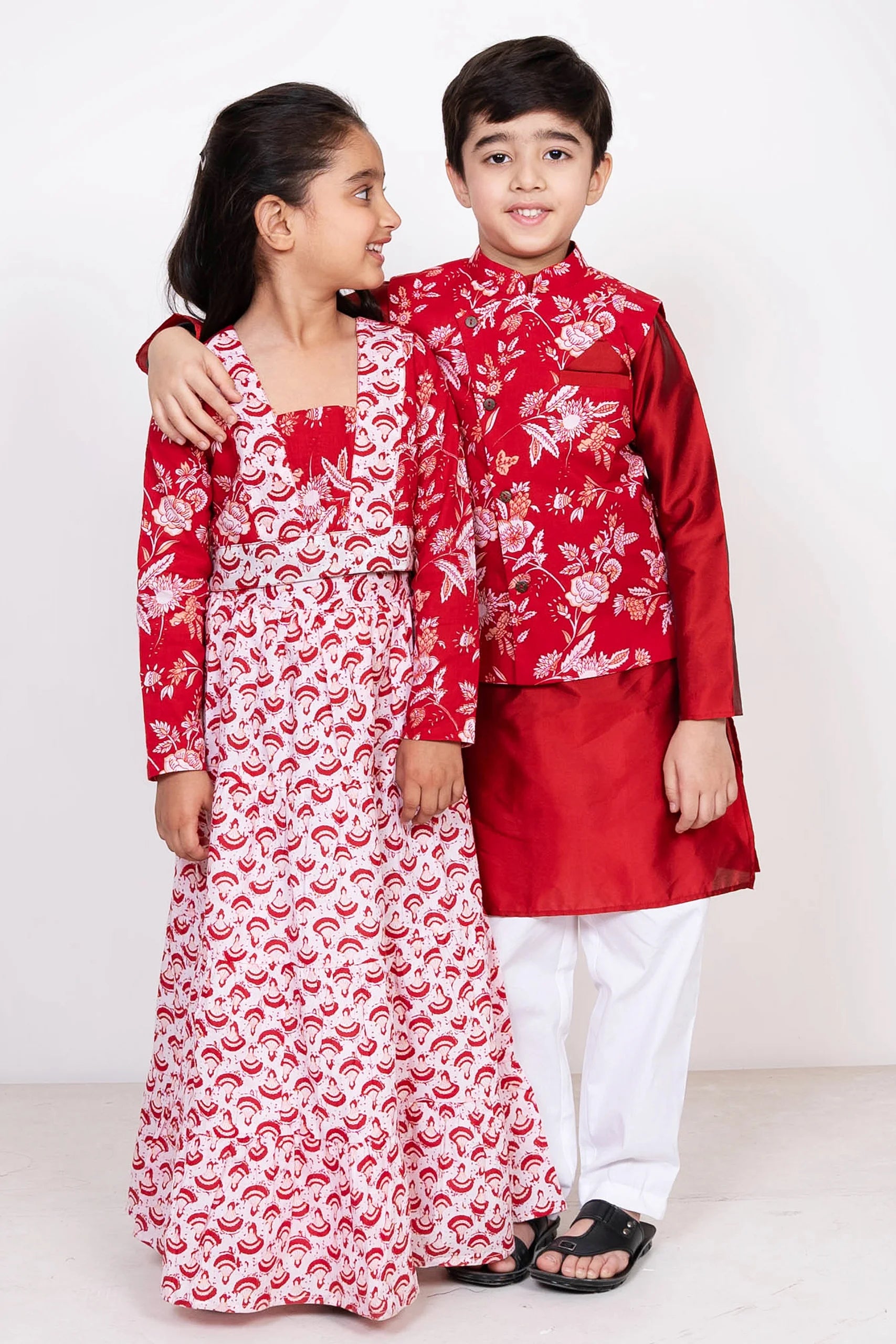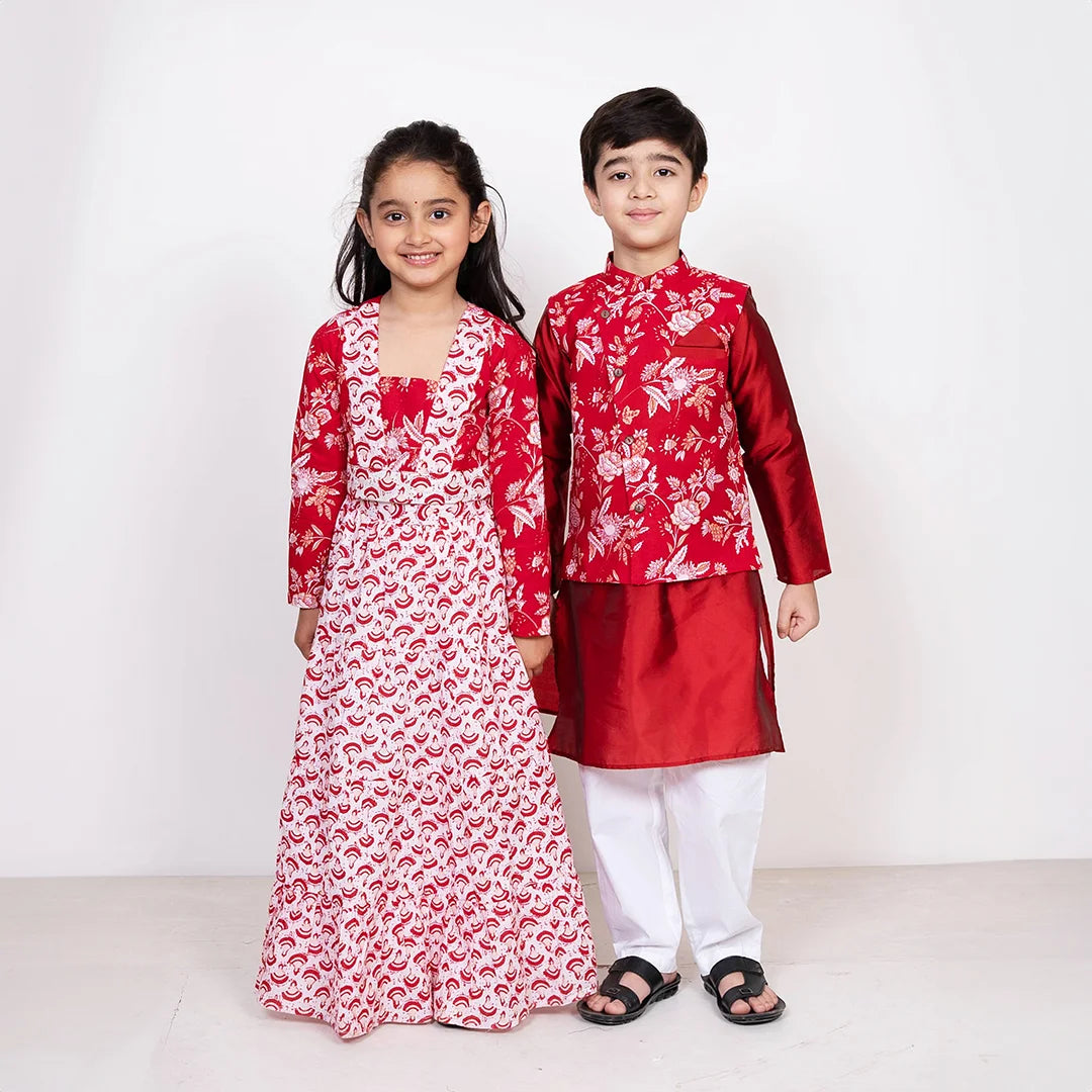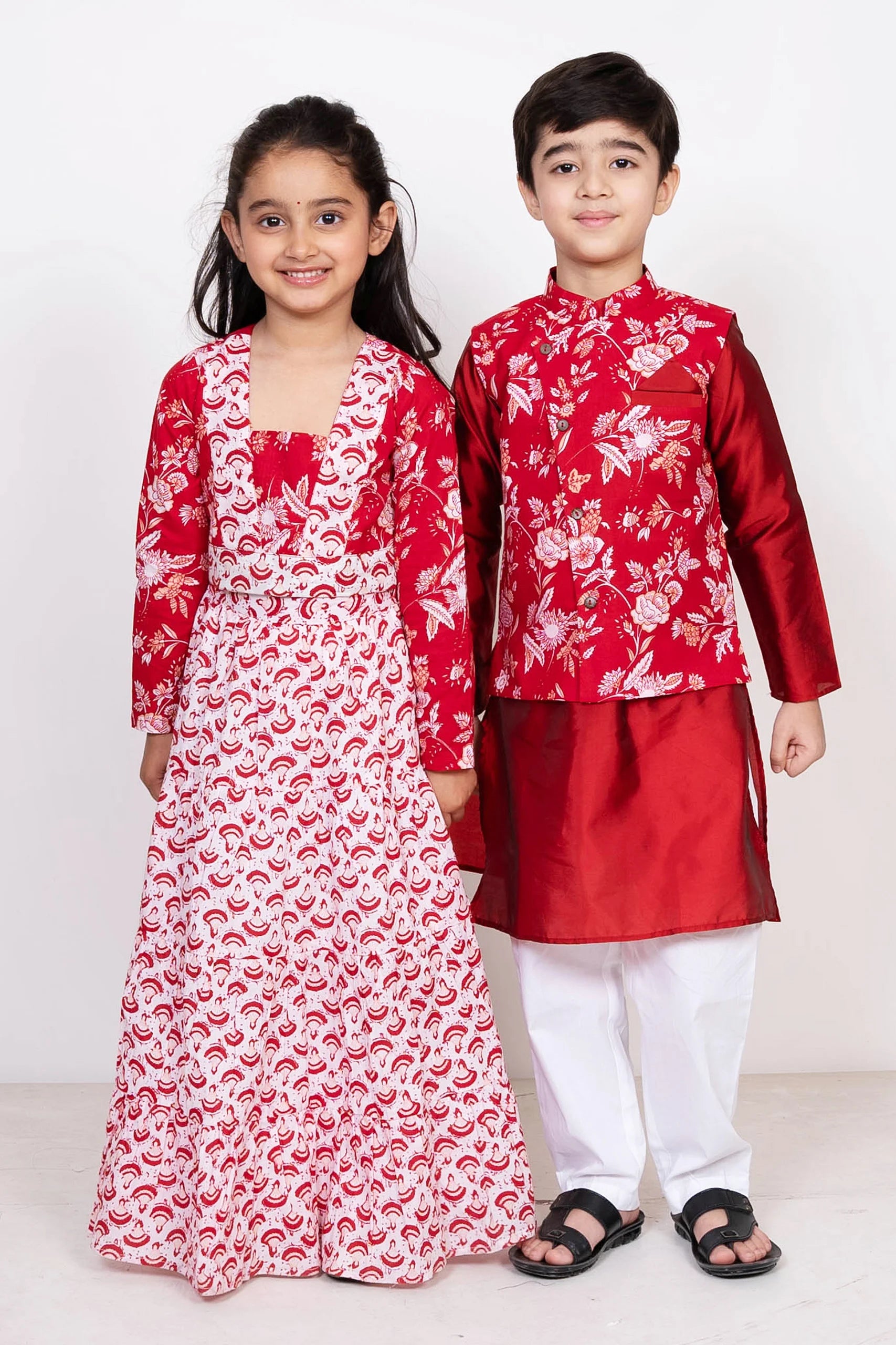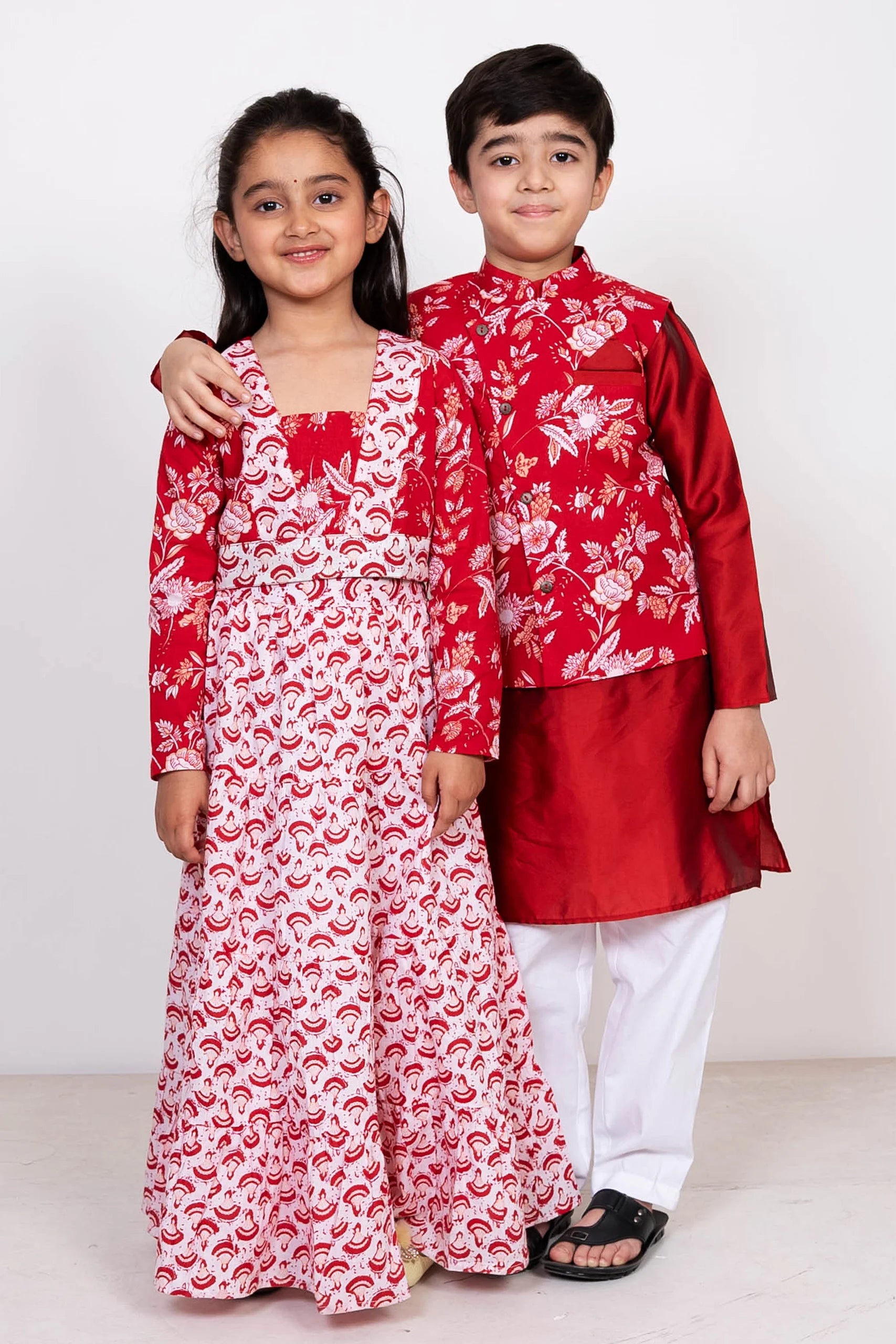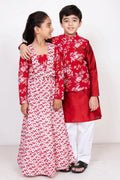Maroon & White Floral Rubta Lehenga With Matching Kurta & Pyjama for Brother-Sister Duo