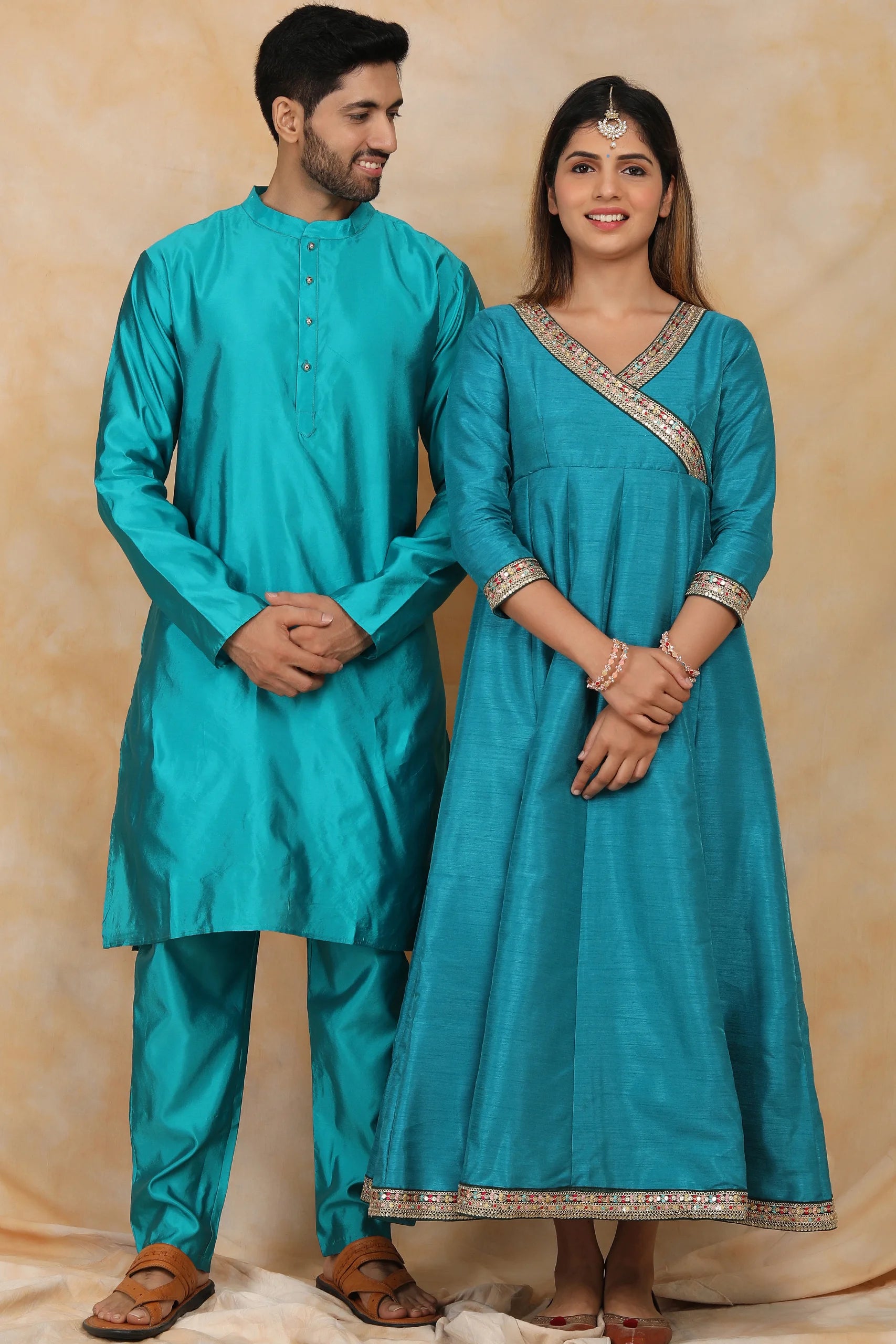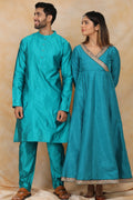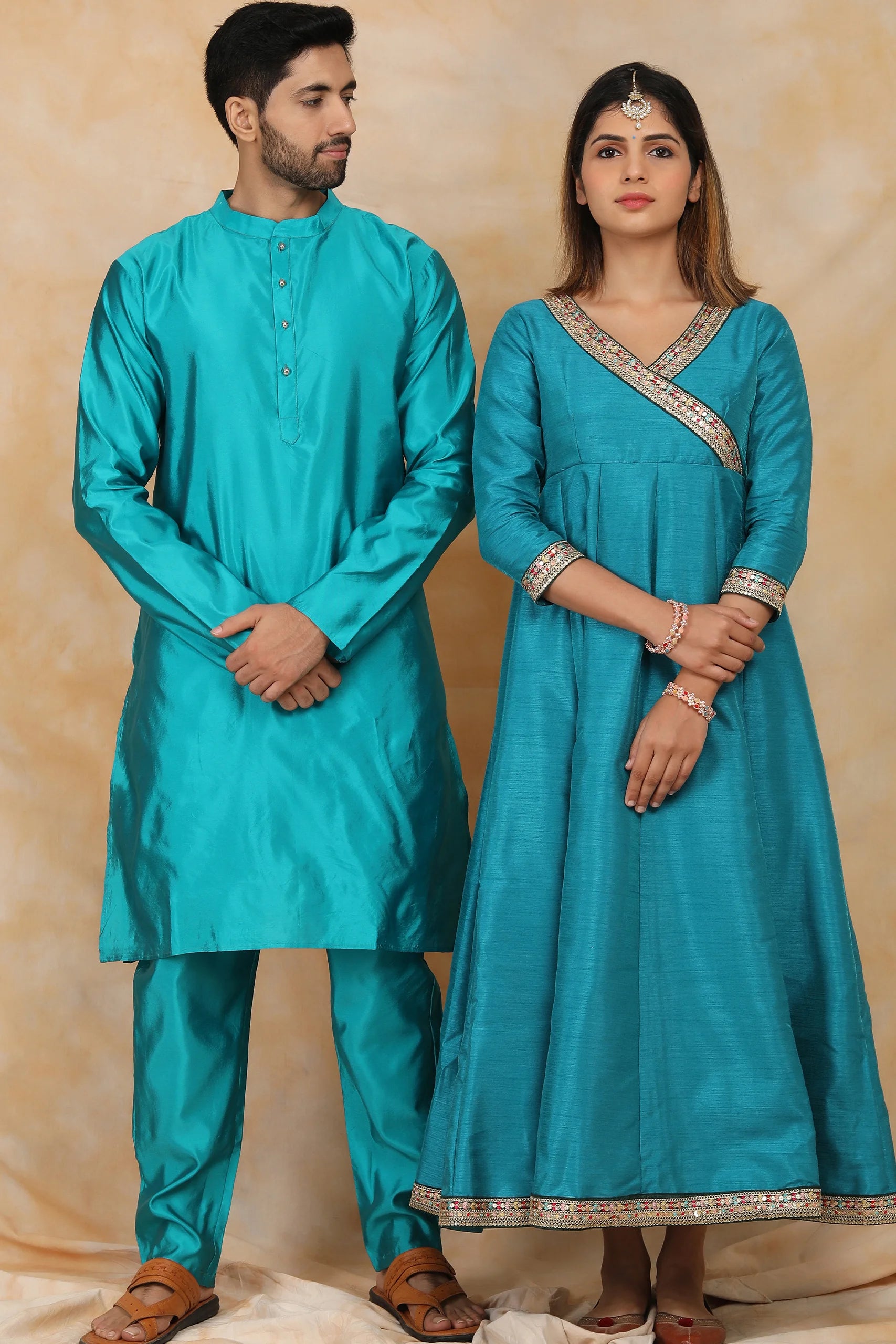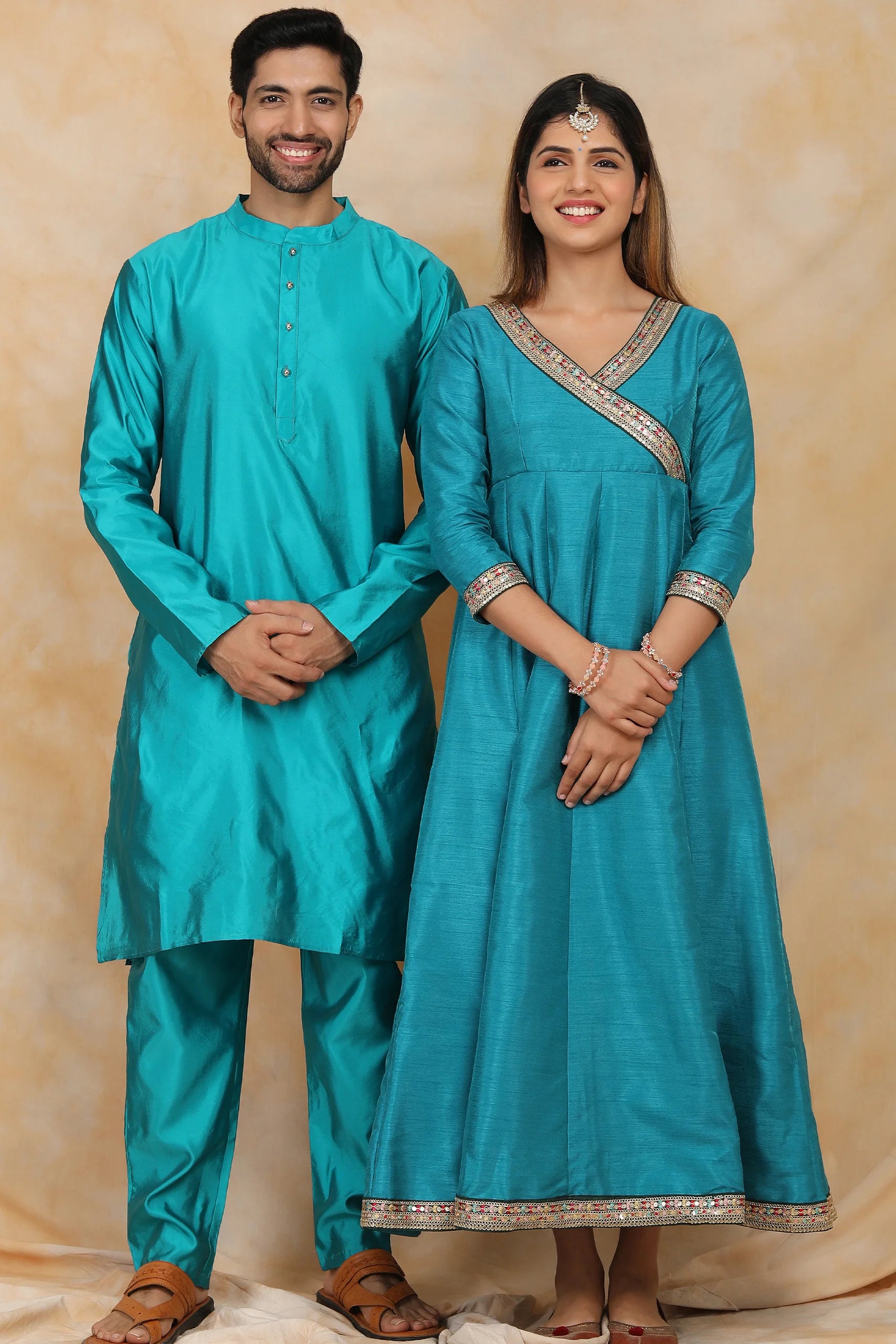 Exquisite Peacock Blue Ethnic Silk Gown with Matching Kurta Pyjama Couple Set