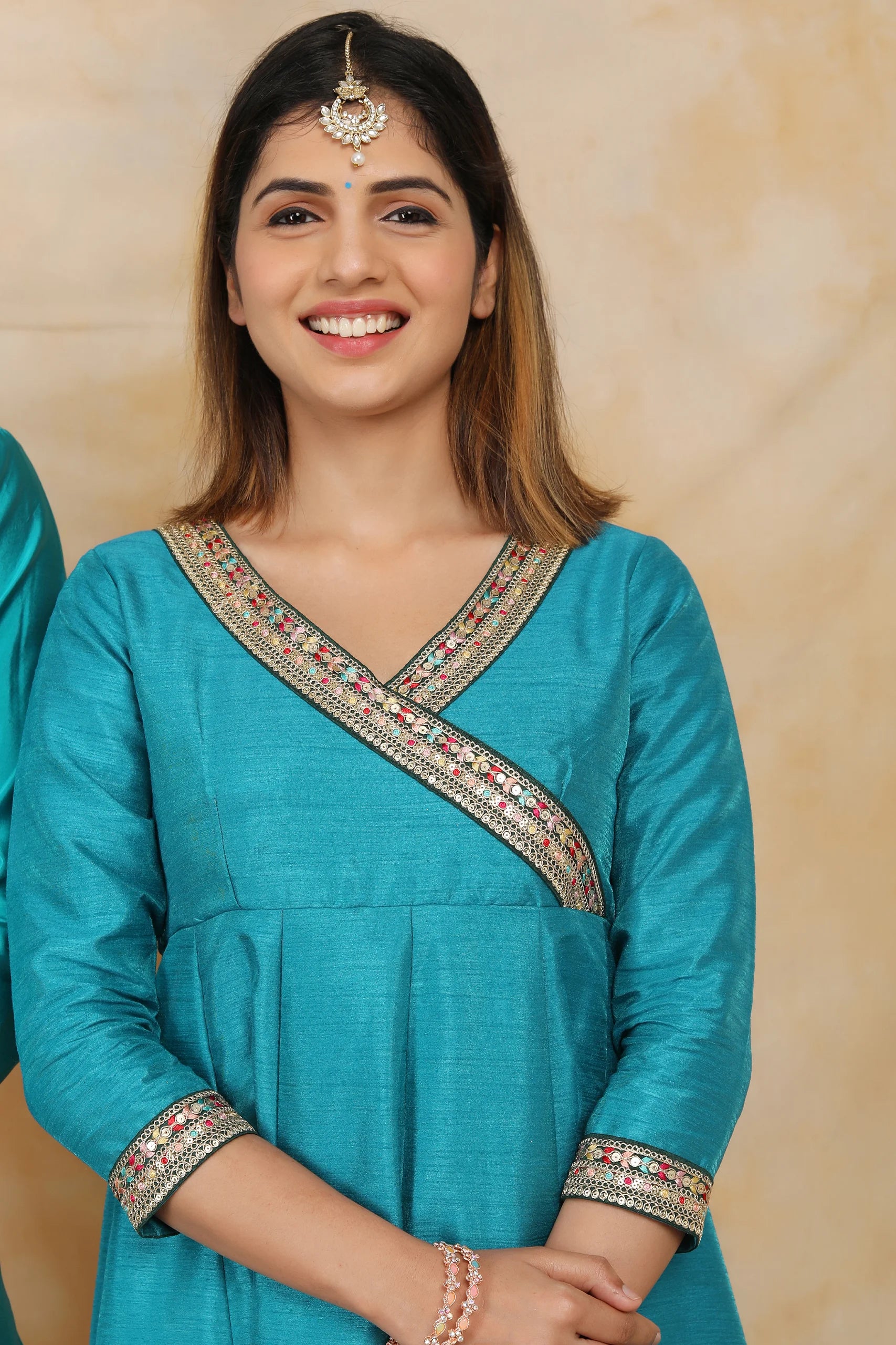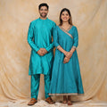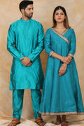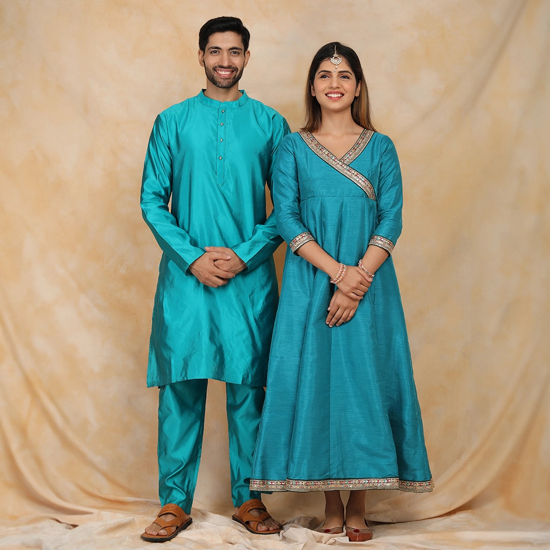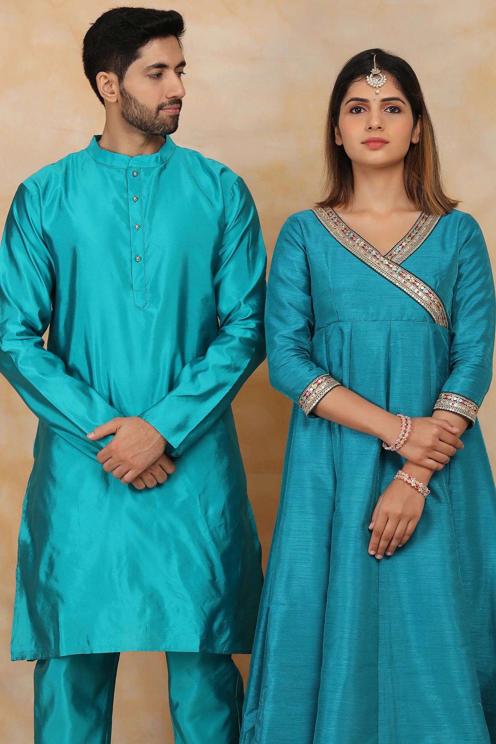 Exquisite Peacock Blue Ethnic Silk Gown with Matching Kurta Pyjama Couple Set