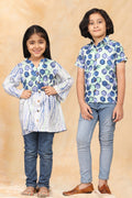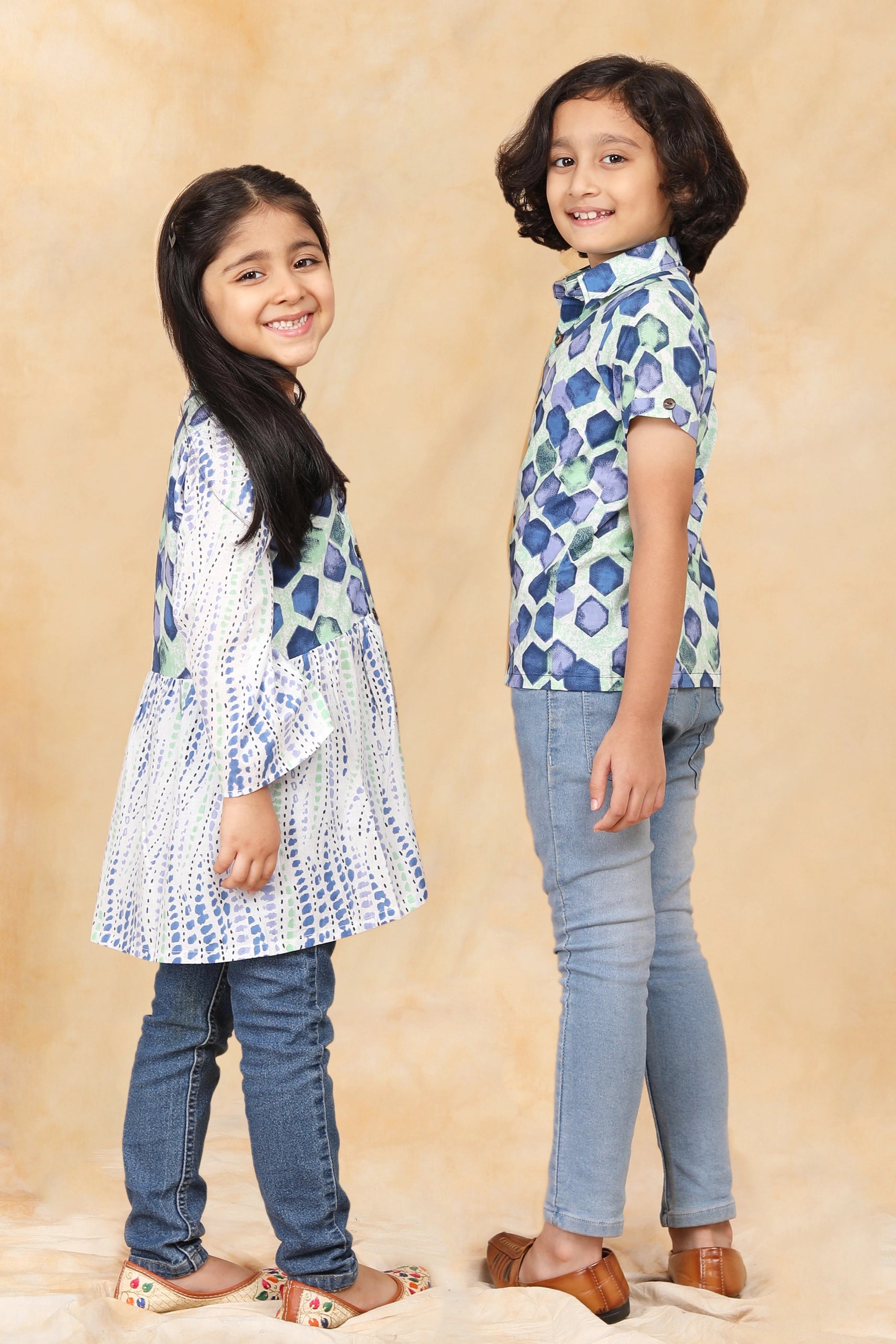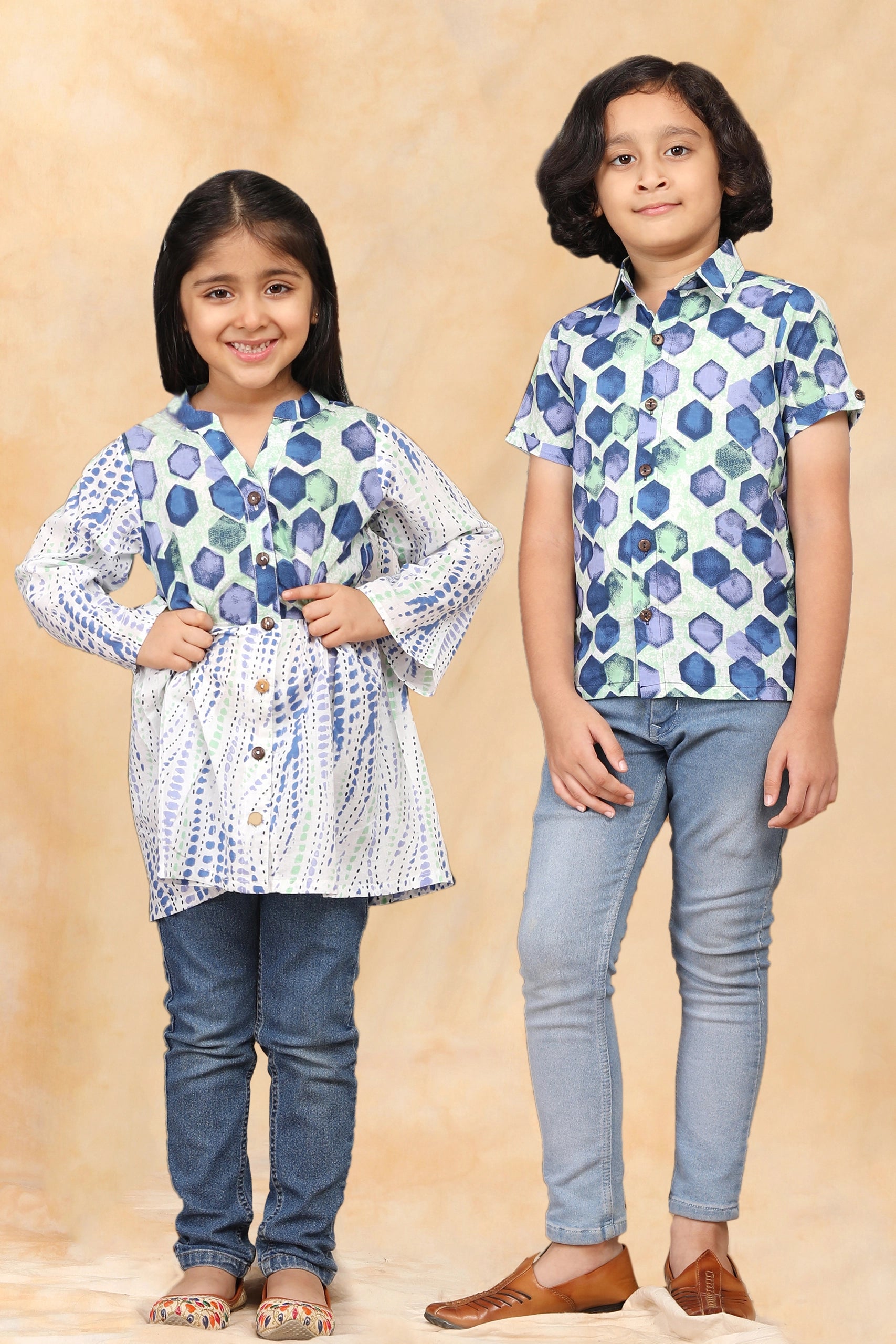 Blue and White printed Tunic with Matching Shirt Brother and Sister Twin Set