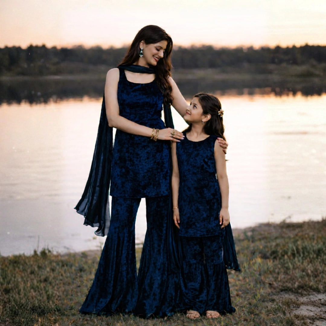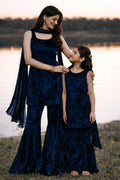 Velvet Luxe Sharara Set For Mom & Daughter - Navy Blue