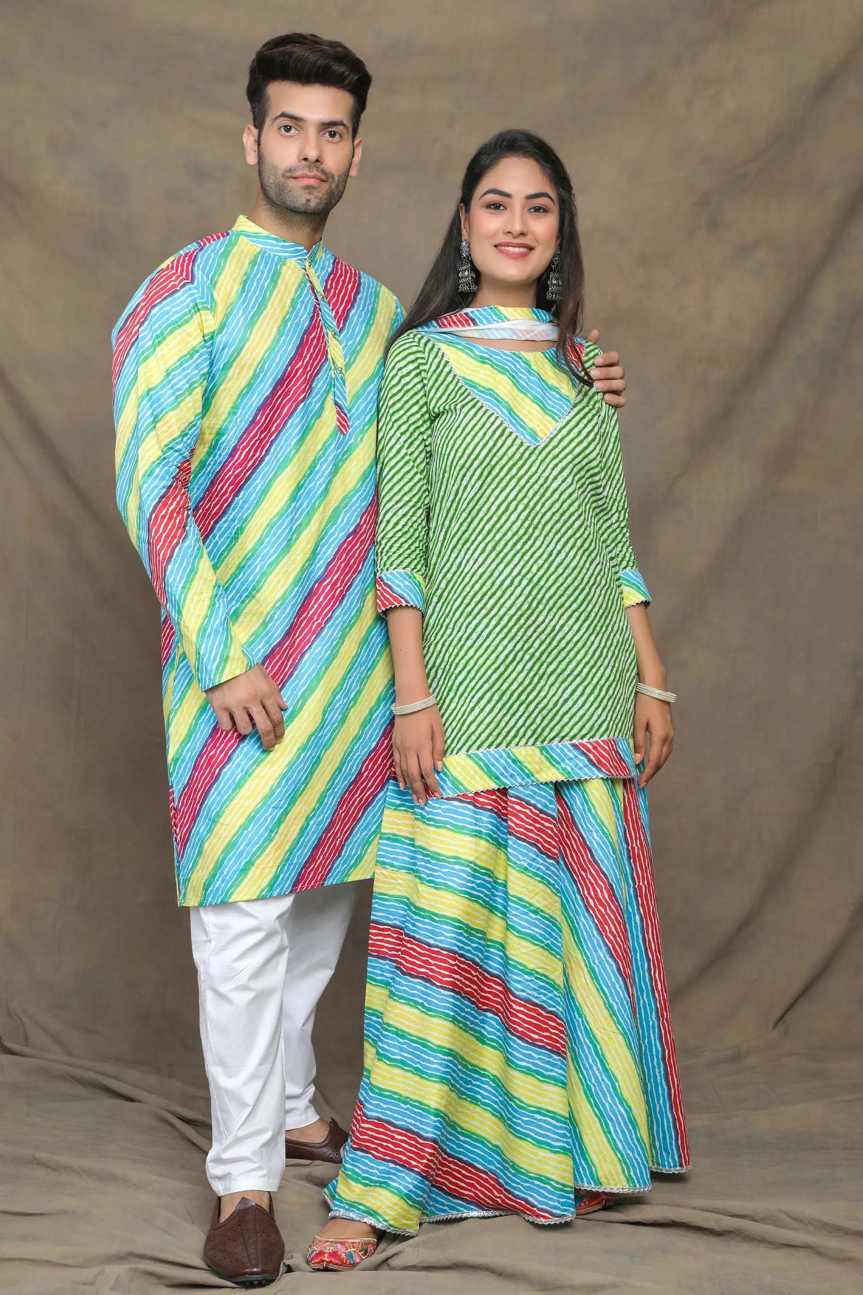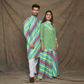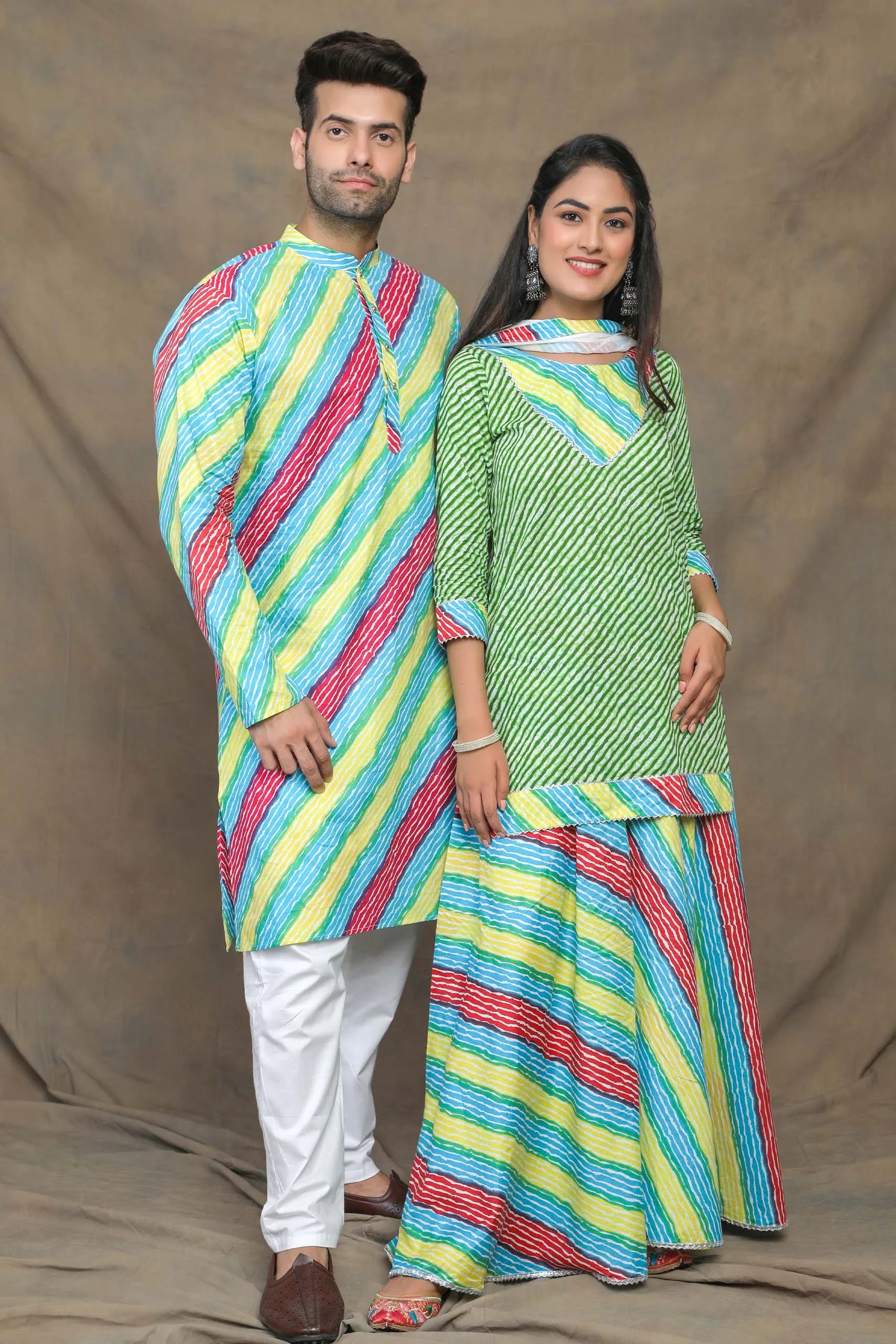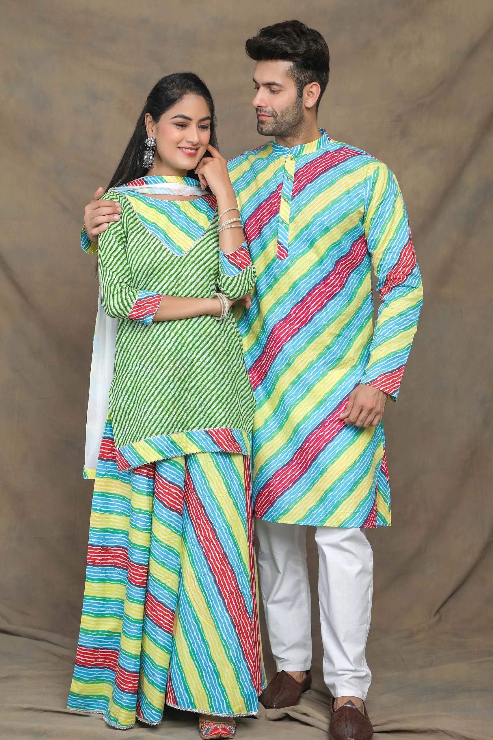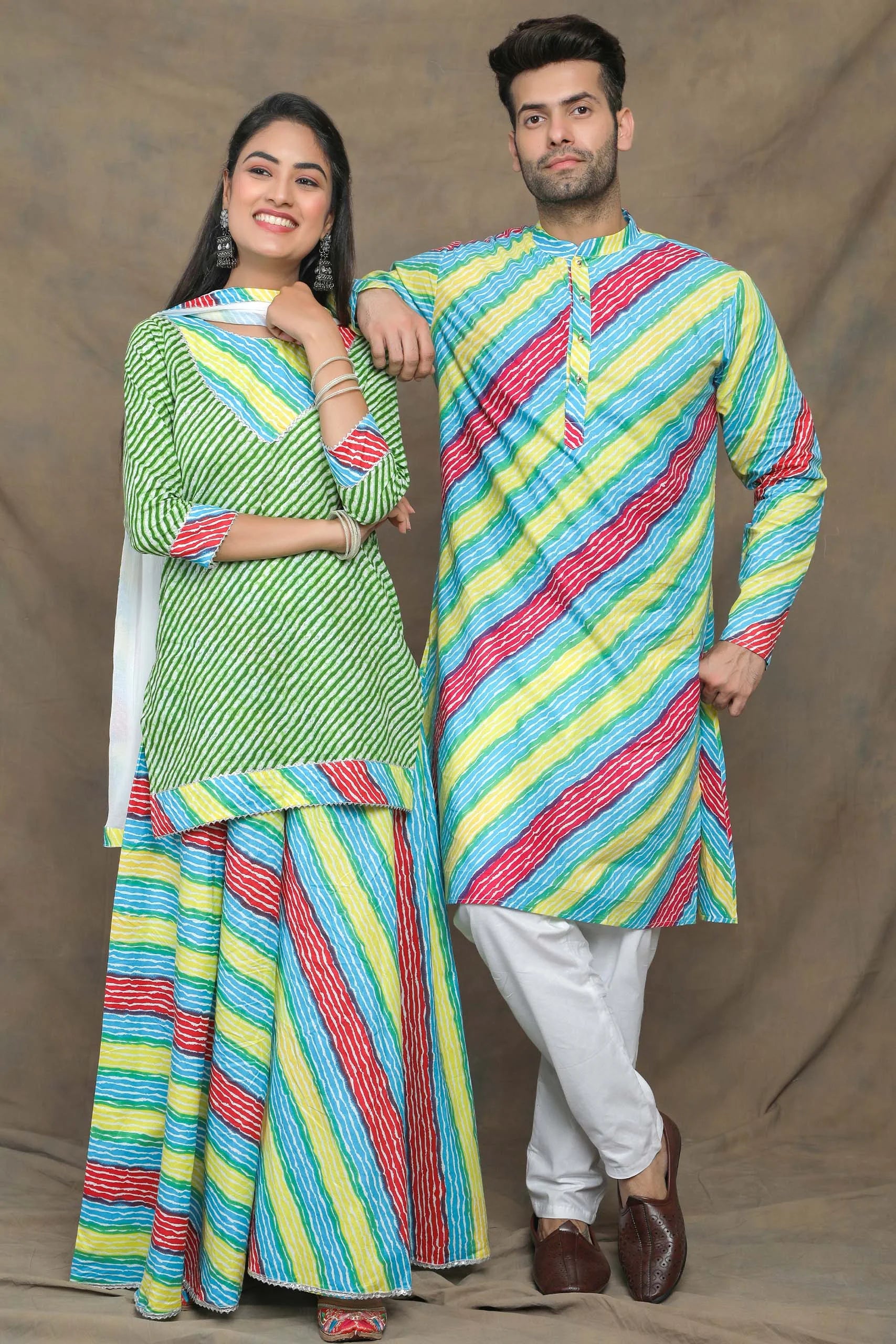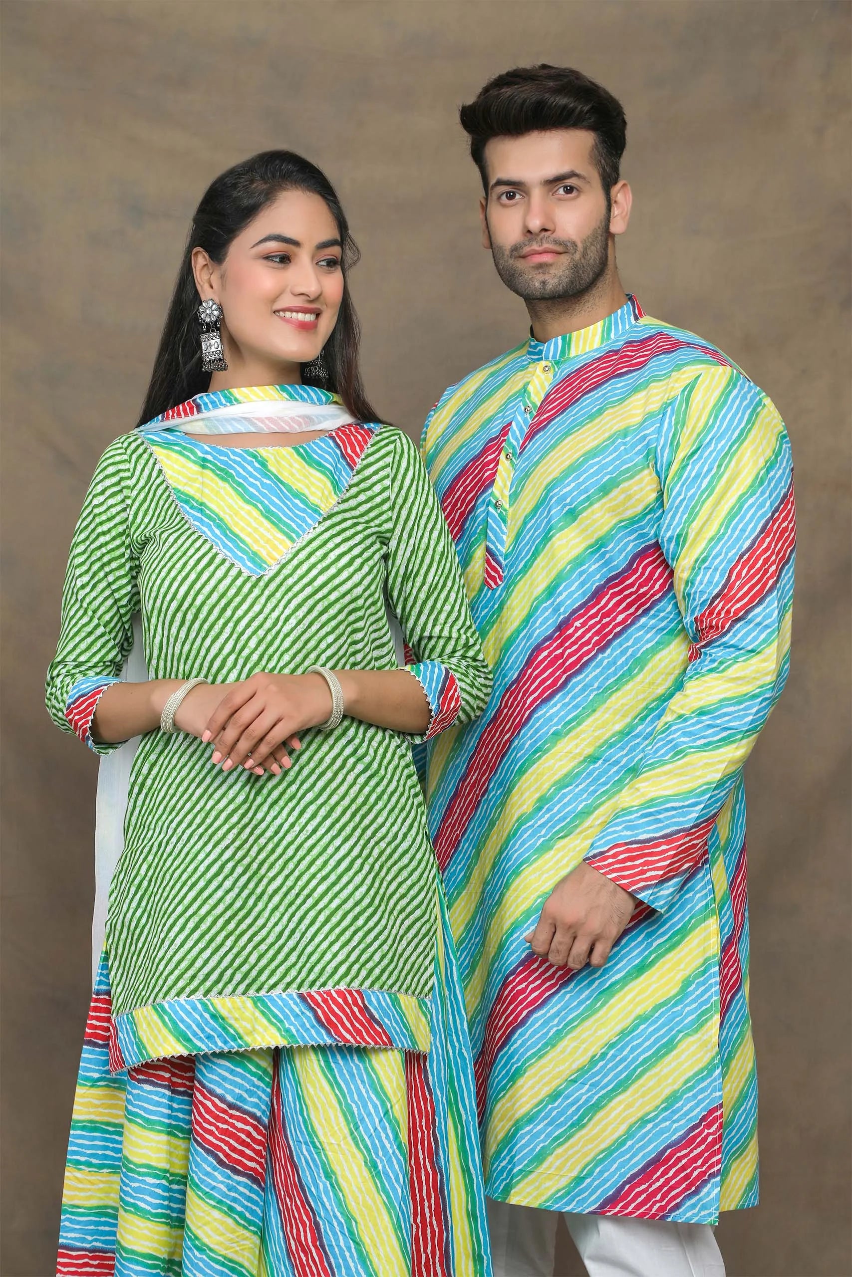 Vibrant Green And Multicolored Leheriya Couple Twin Set