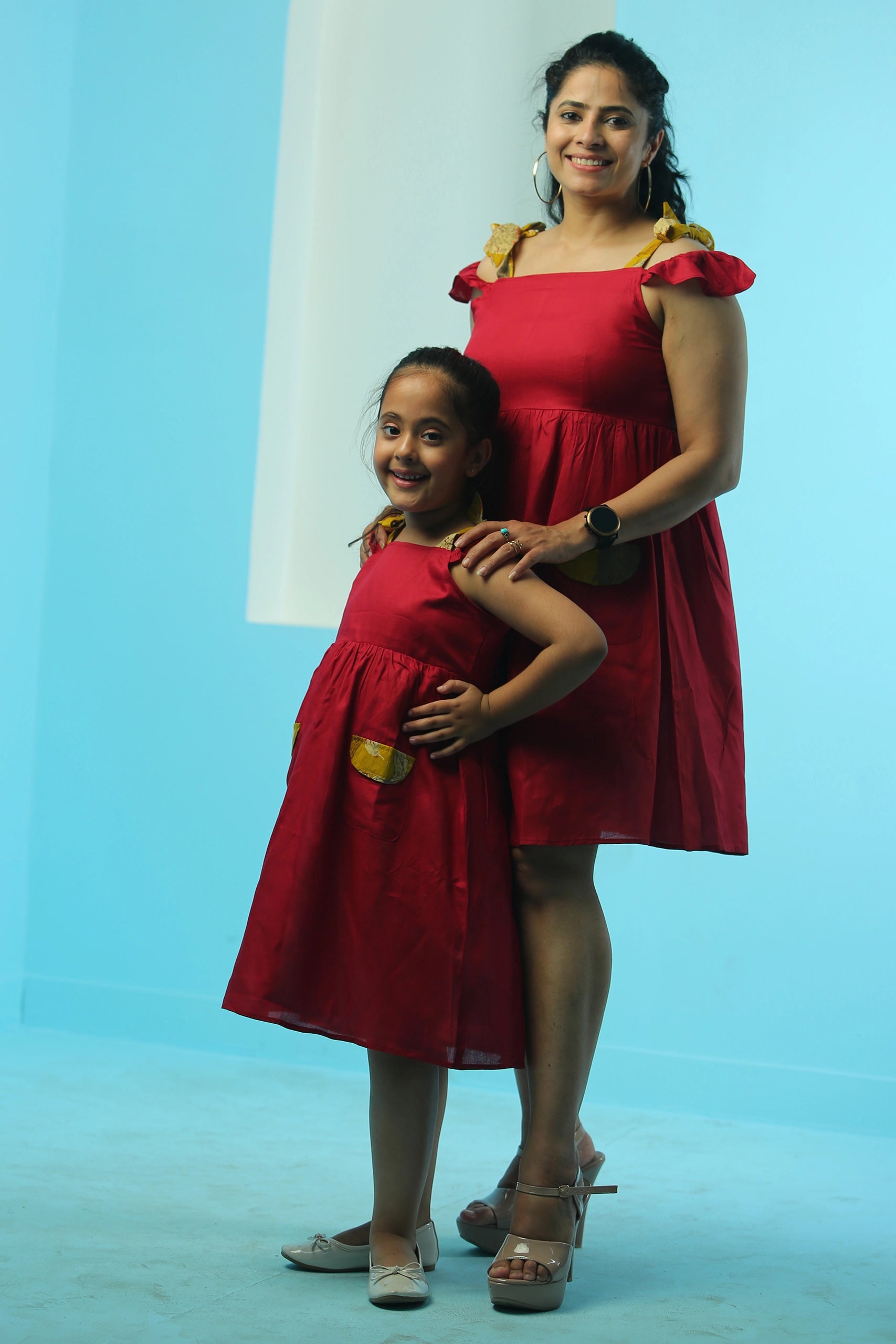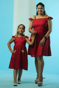 Maroon Cotton Off-Shoulder Ruffle Dress For Mom And Daughter