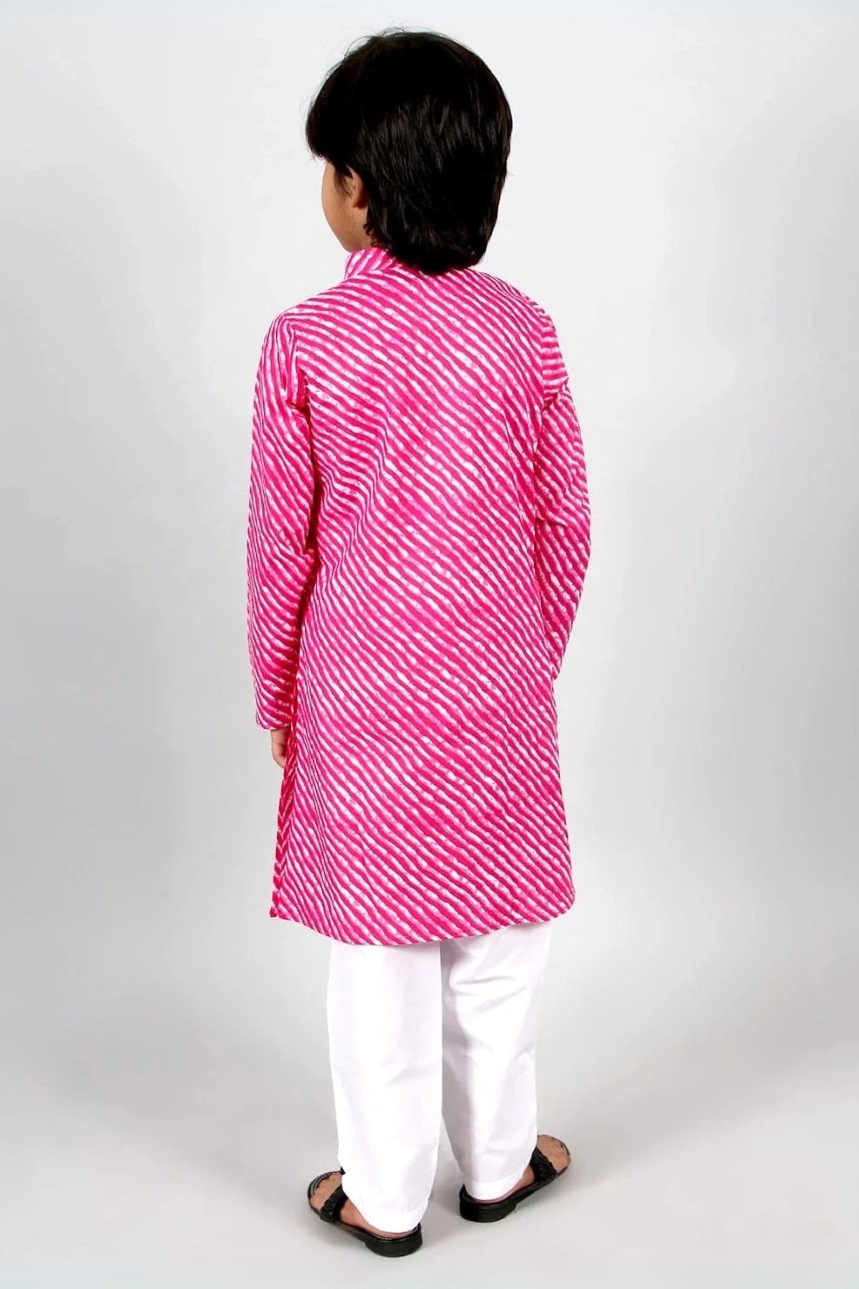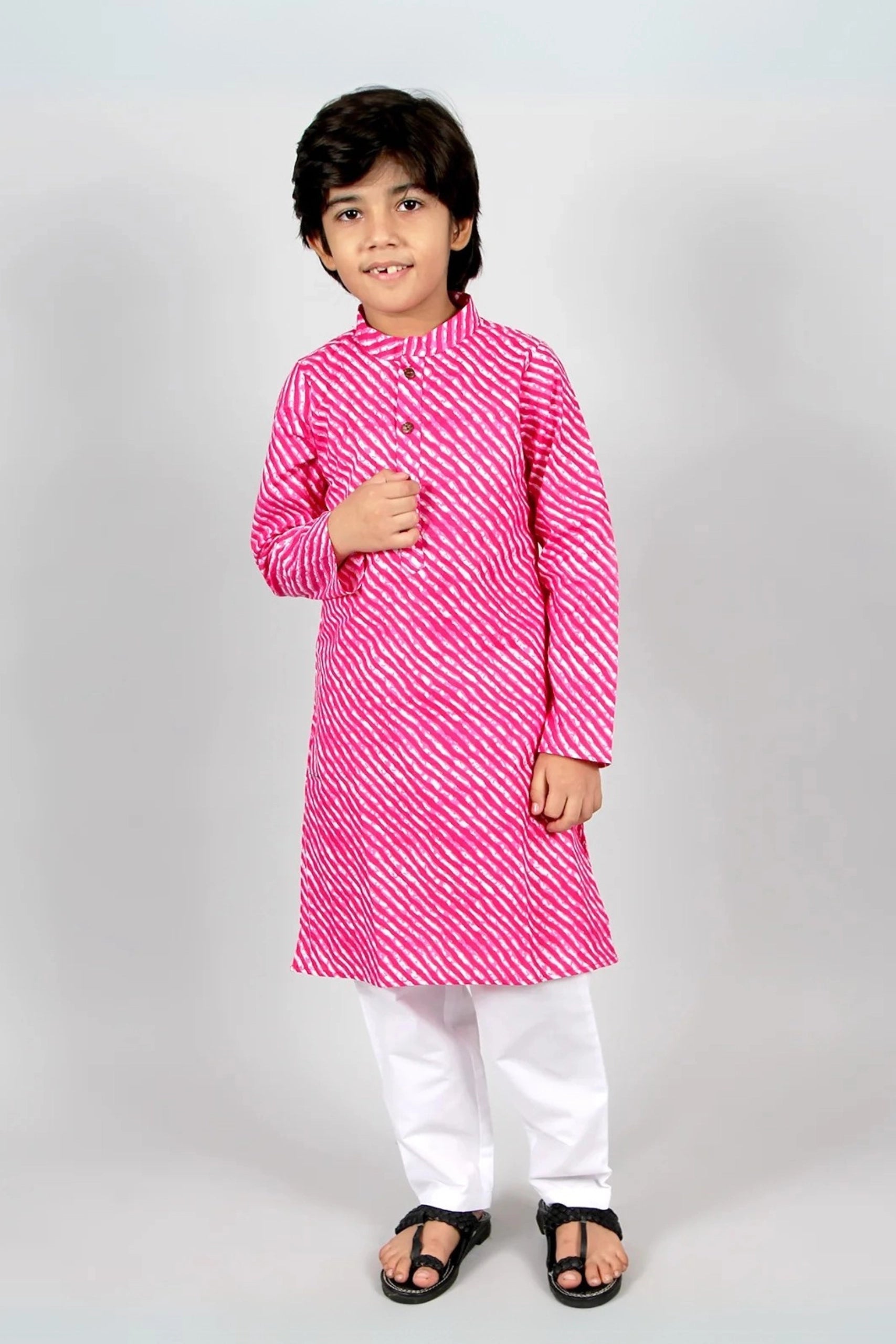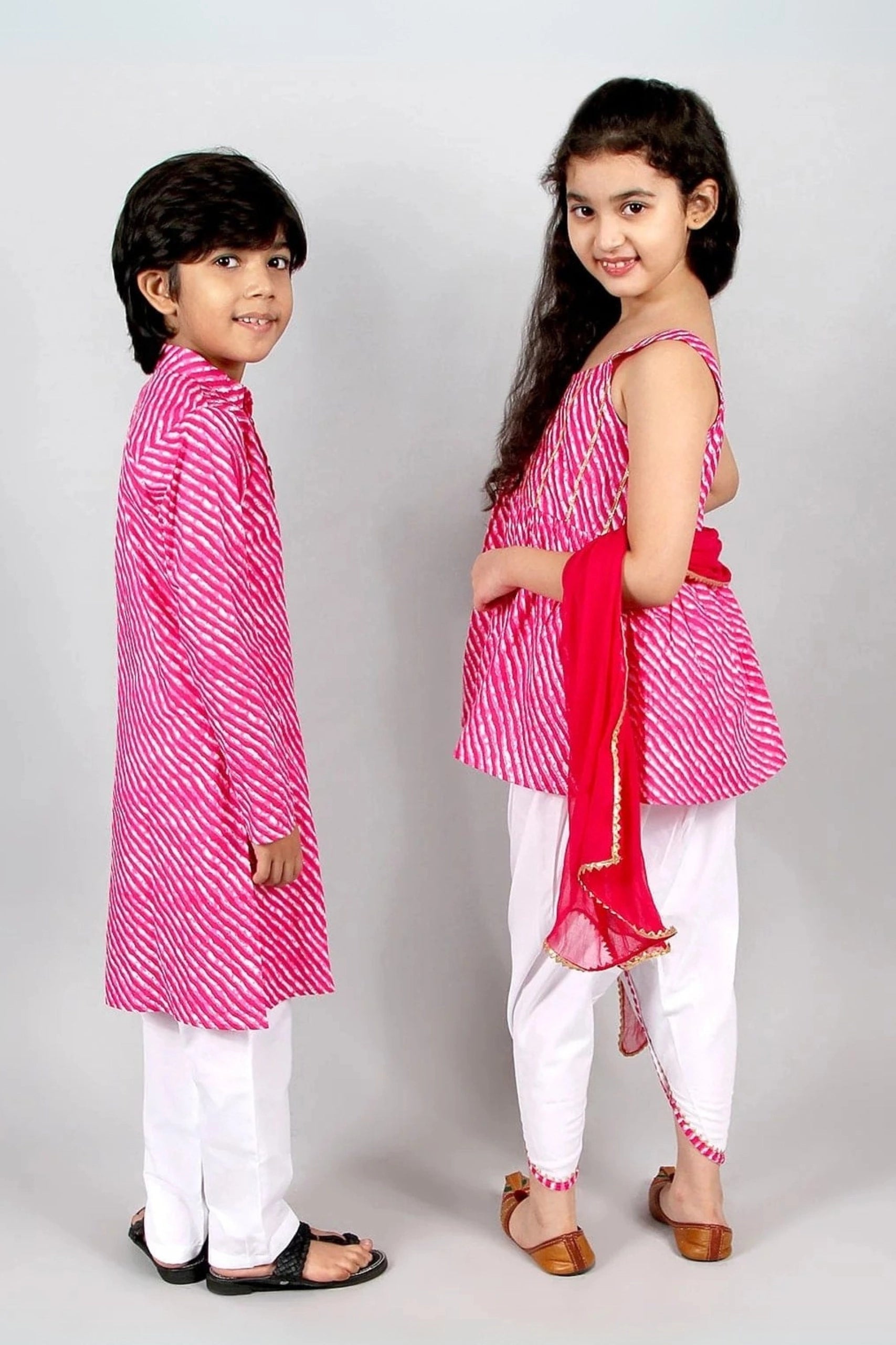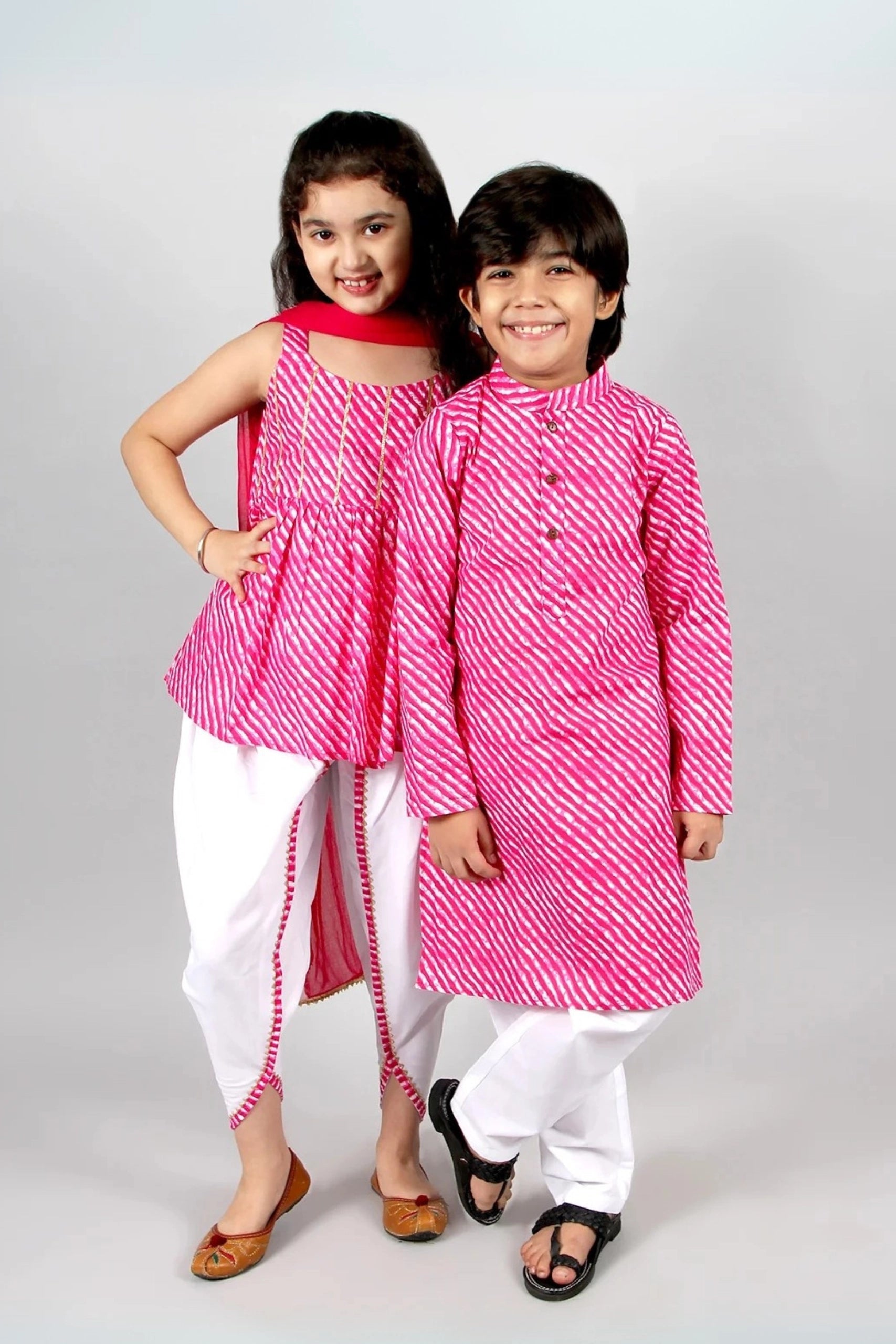 Fuchsia Leheriya Kurta-Pyjama With Kurta - Dhoti For Brother& Sister Set