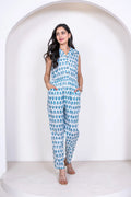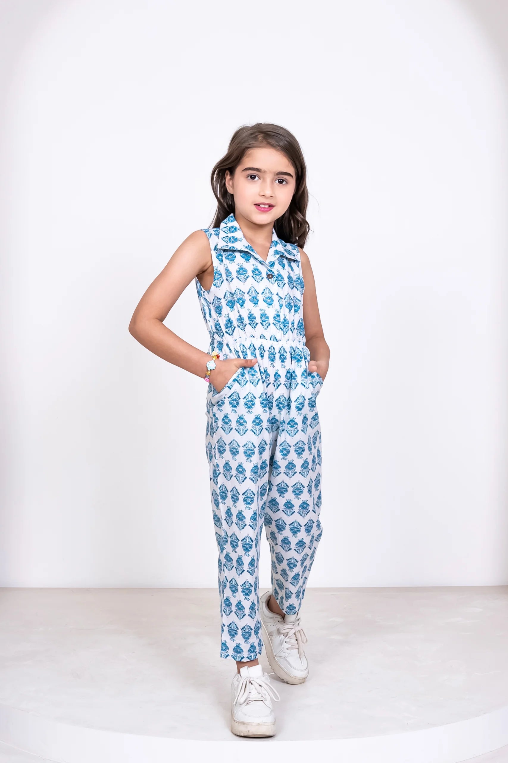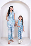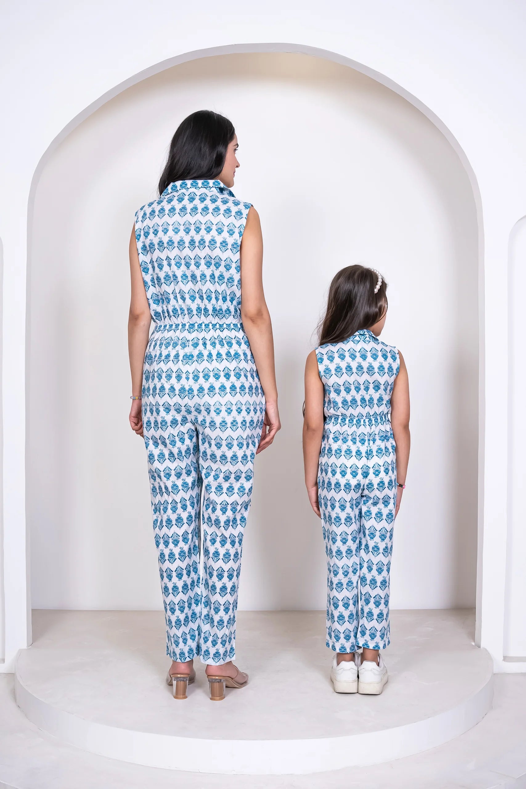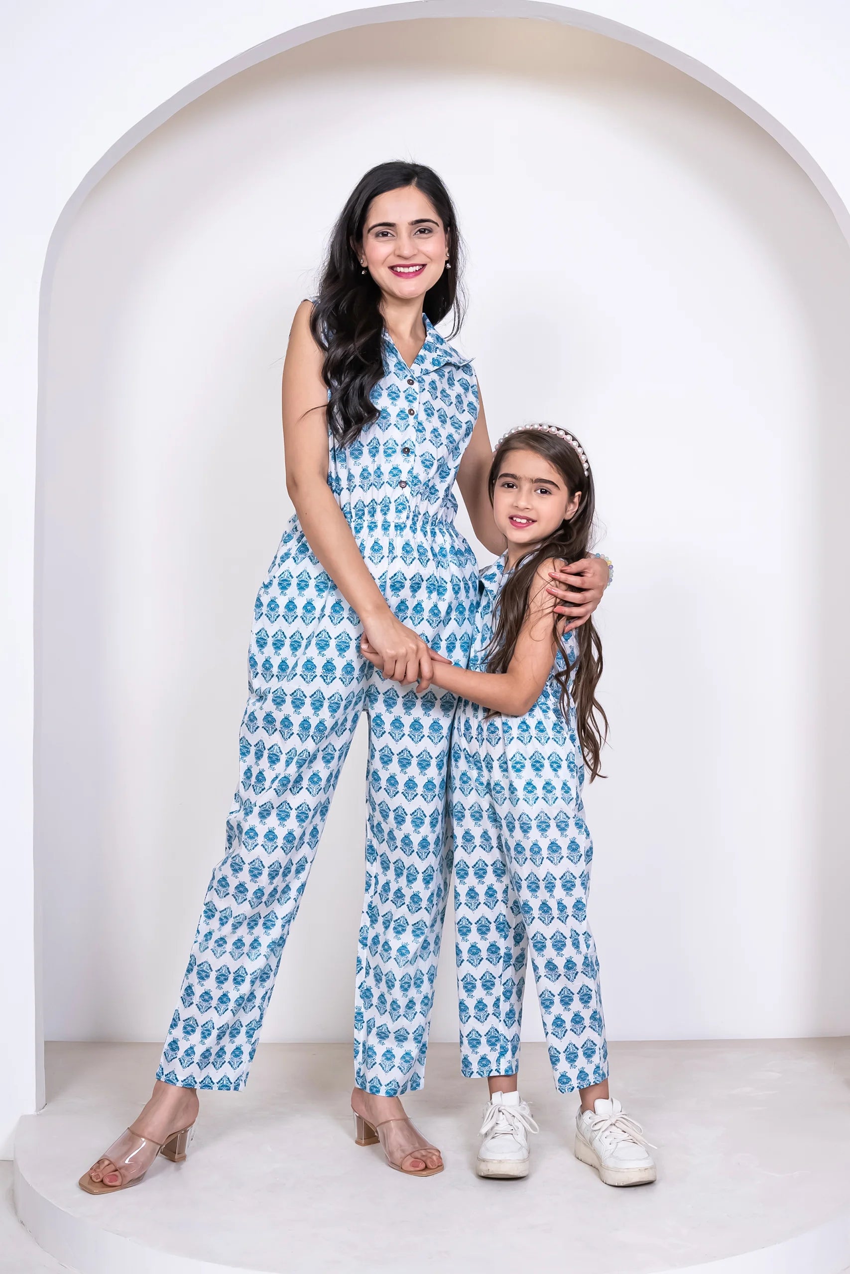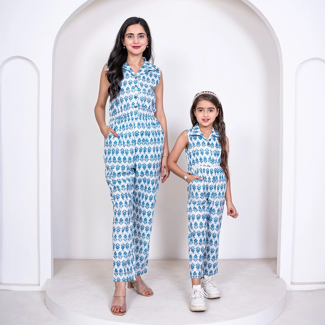 Stylish Matching Summer Wear: White and Teal Printed Cotton Jumpsuit for Mom and Daughter