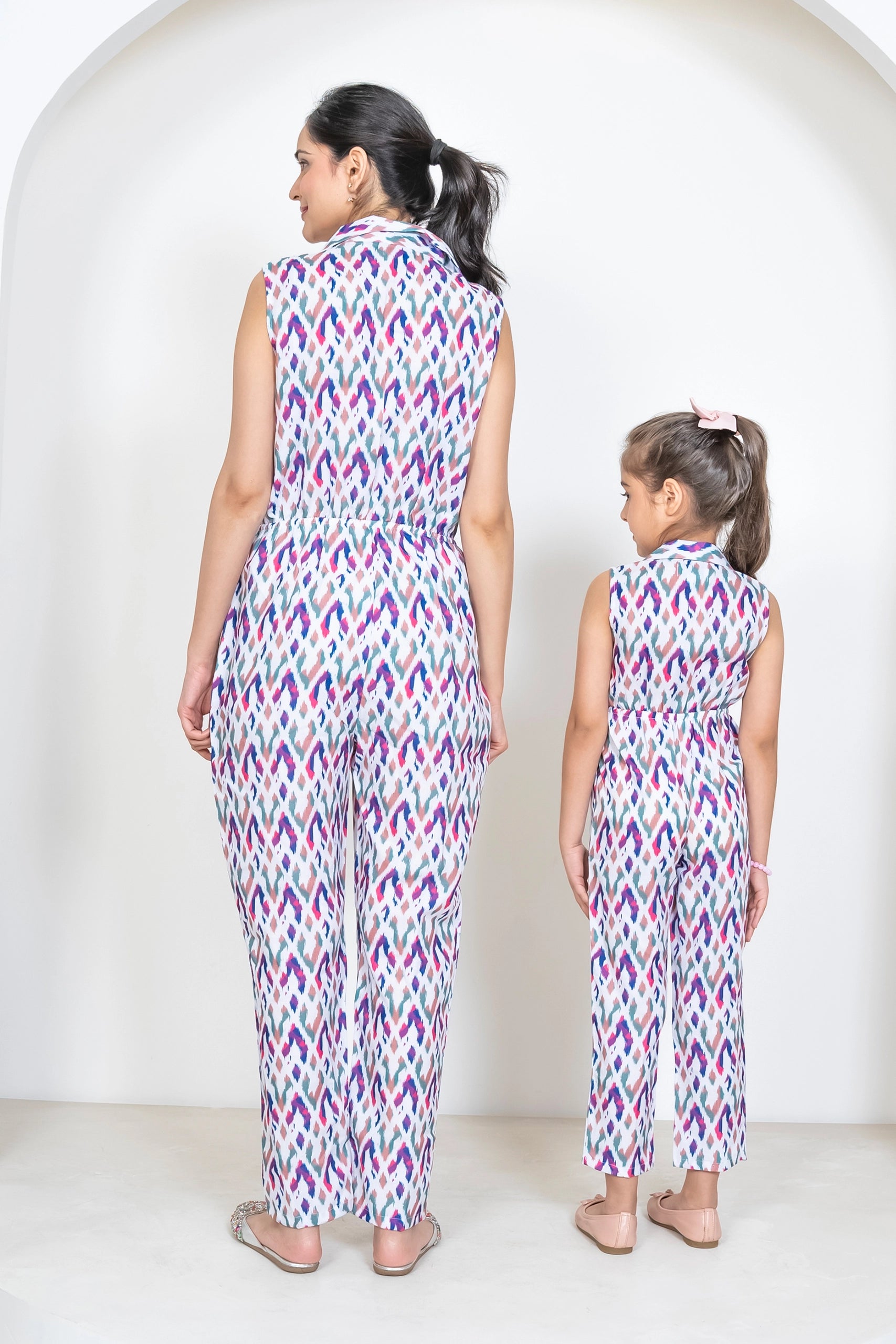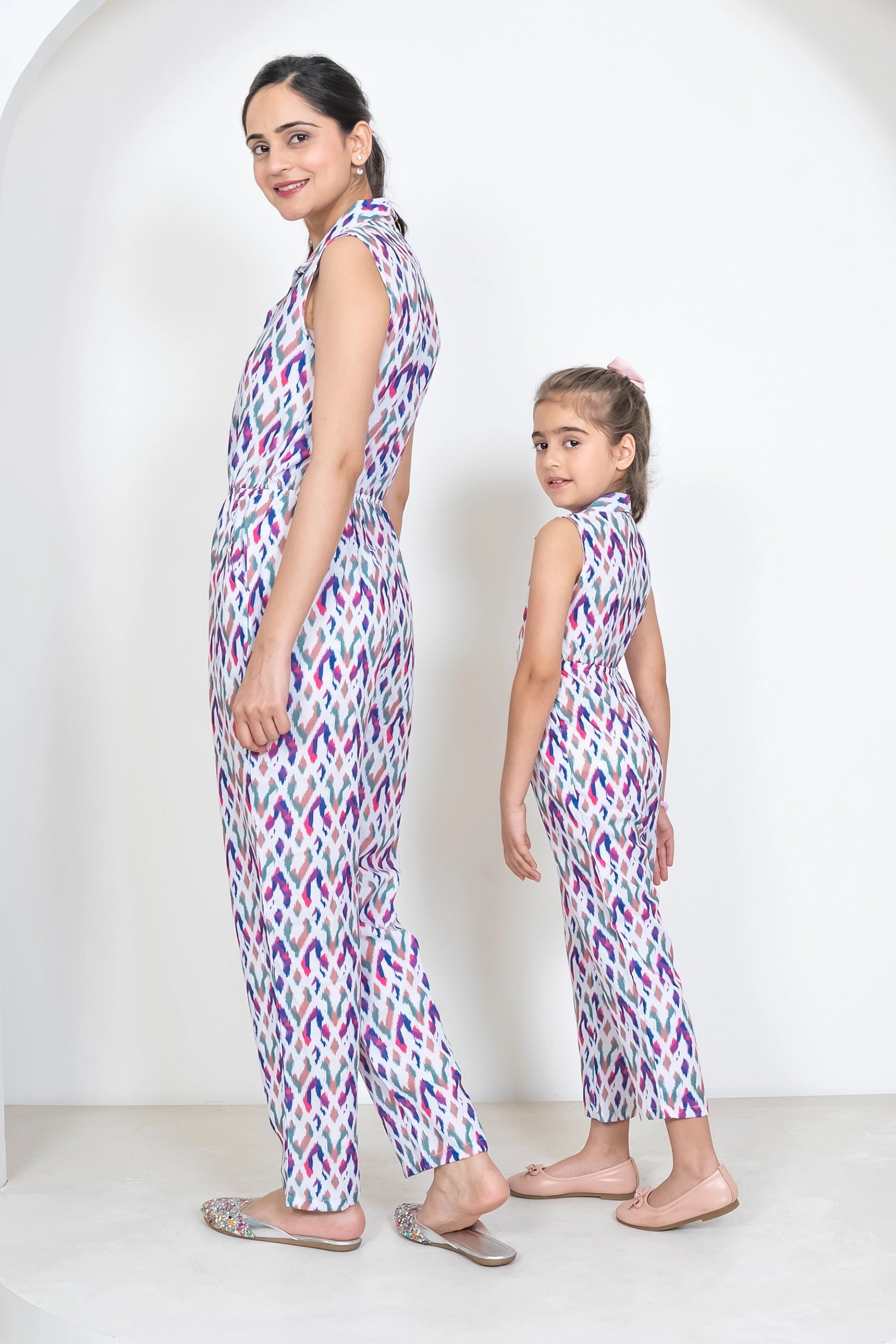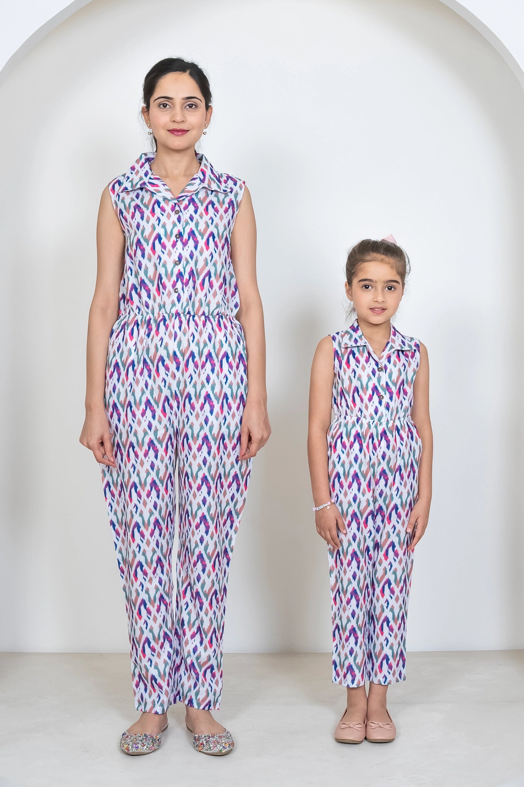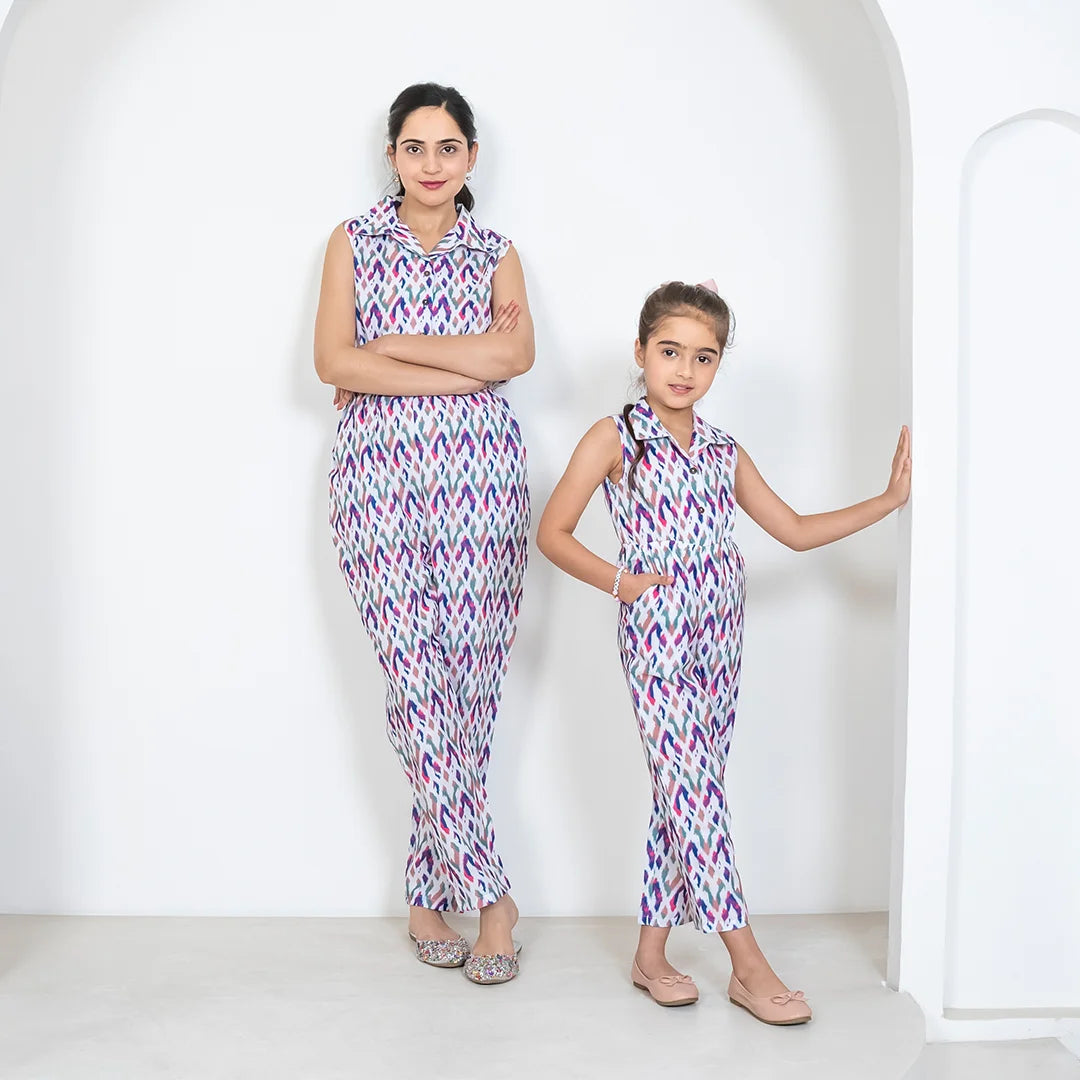 Ikkat Multicolored Jumpsuit Duo: Matching Outfits for Mom and Daughter, Perfect for Vacation