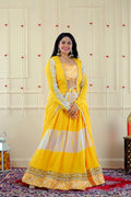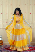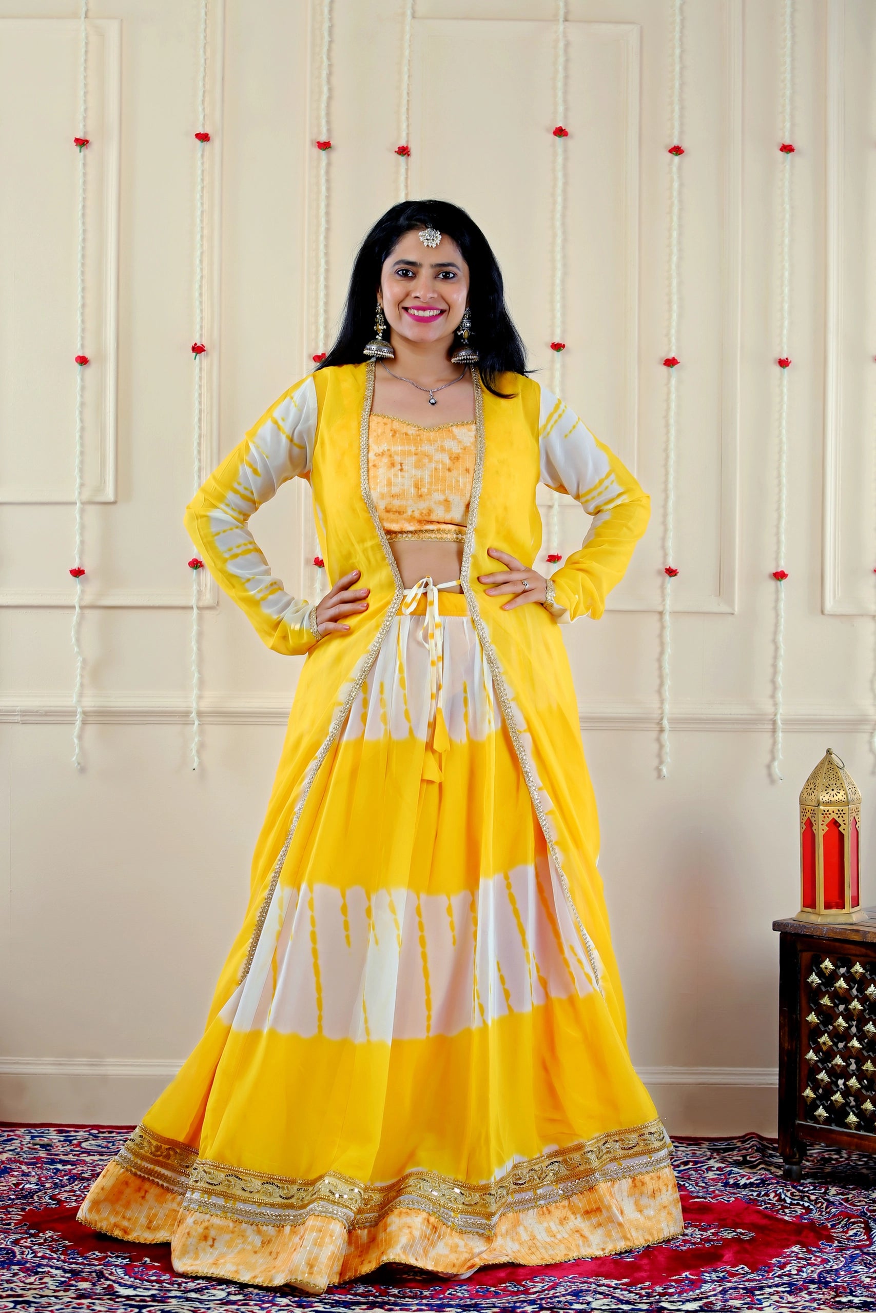 Yellow and White Shaded Crop Top with Lehenga and Over Coat for Women